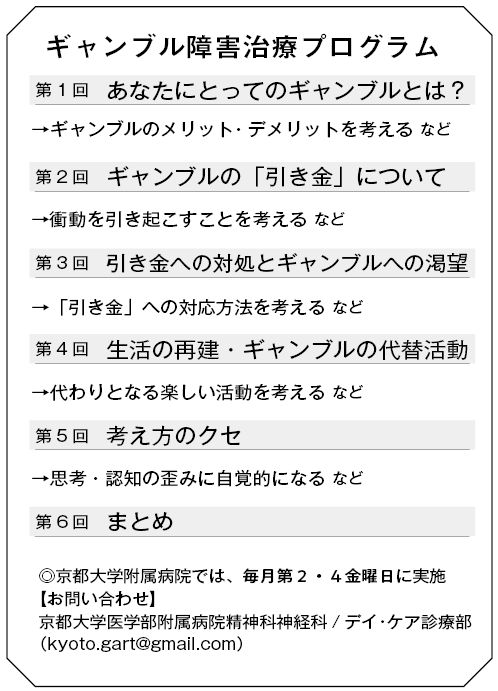 少し話が逸れましたが、プログラムでは、例えば最近ツイていてるから勝てるに違いないとか、今日は7のつく日だから絶対当たるんだとか、ギャンブルの確率を自分がある程度コントロールできるという思い込みや考え方の癖に気づいていただくセッションもあります。