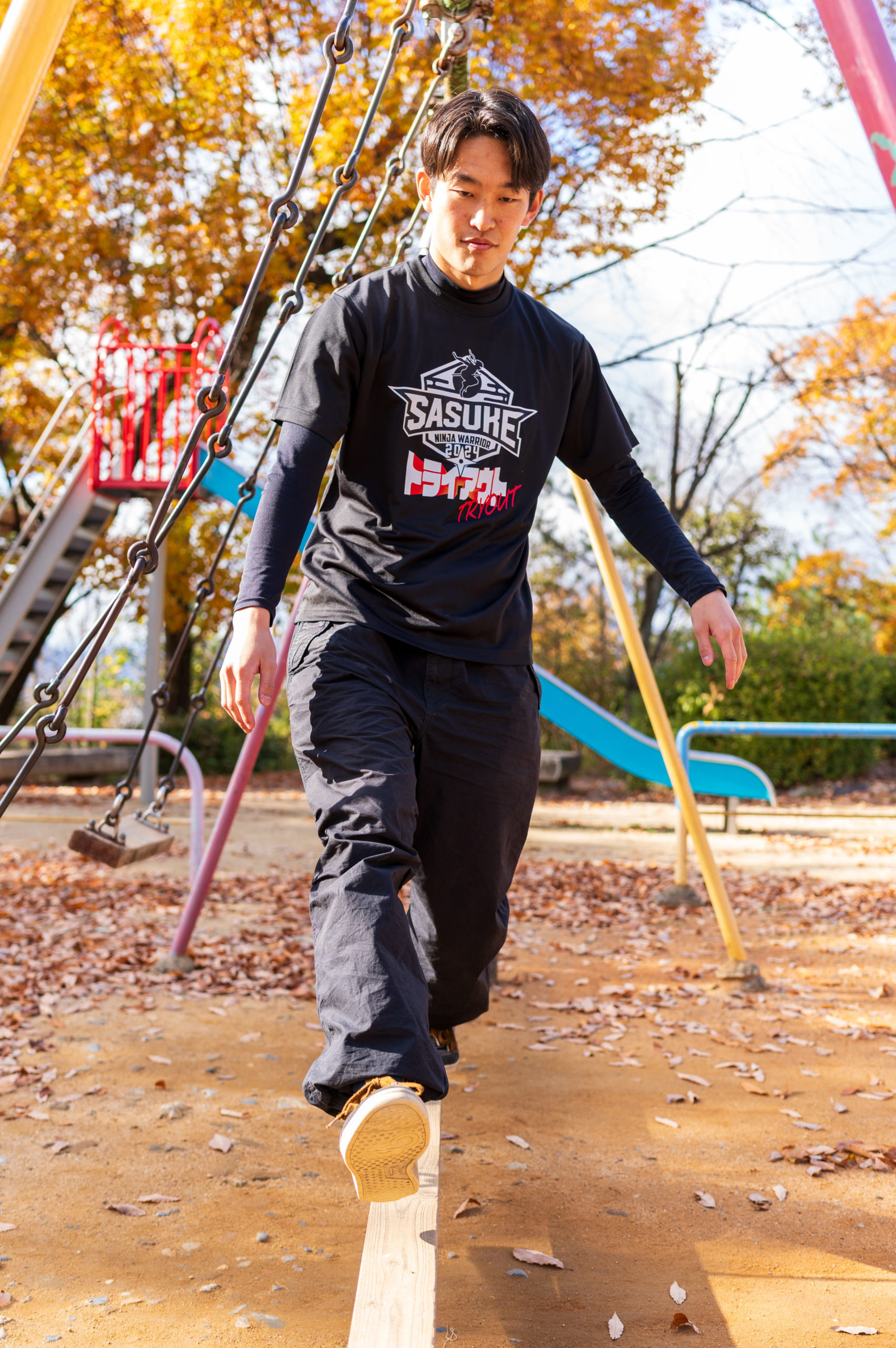 公園の遊具をSASUKEの障害物に見立てることで、SASUKE本番をイメージしてトレーニングに励んでいます。加えて、SASUKEでは総合的な筋肉を求められるので、腕立て伏せや走り込みなども行っています。