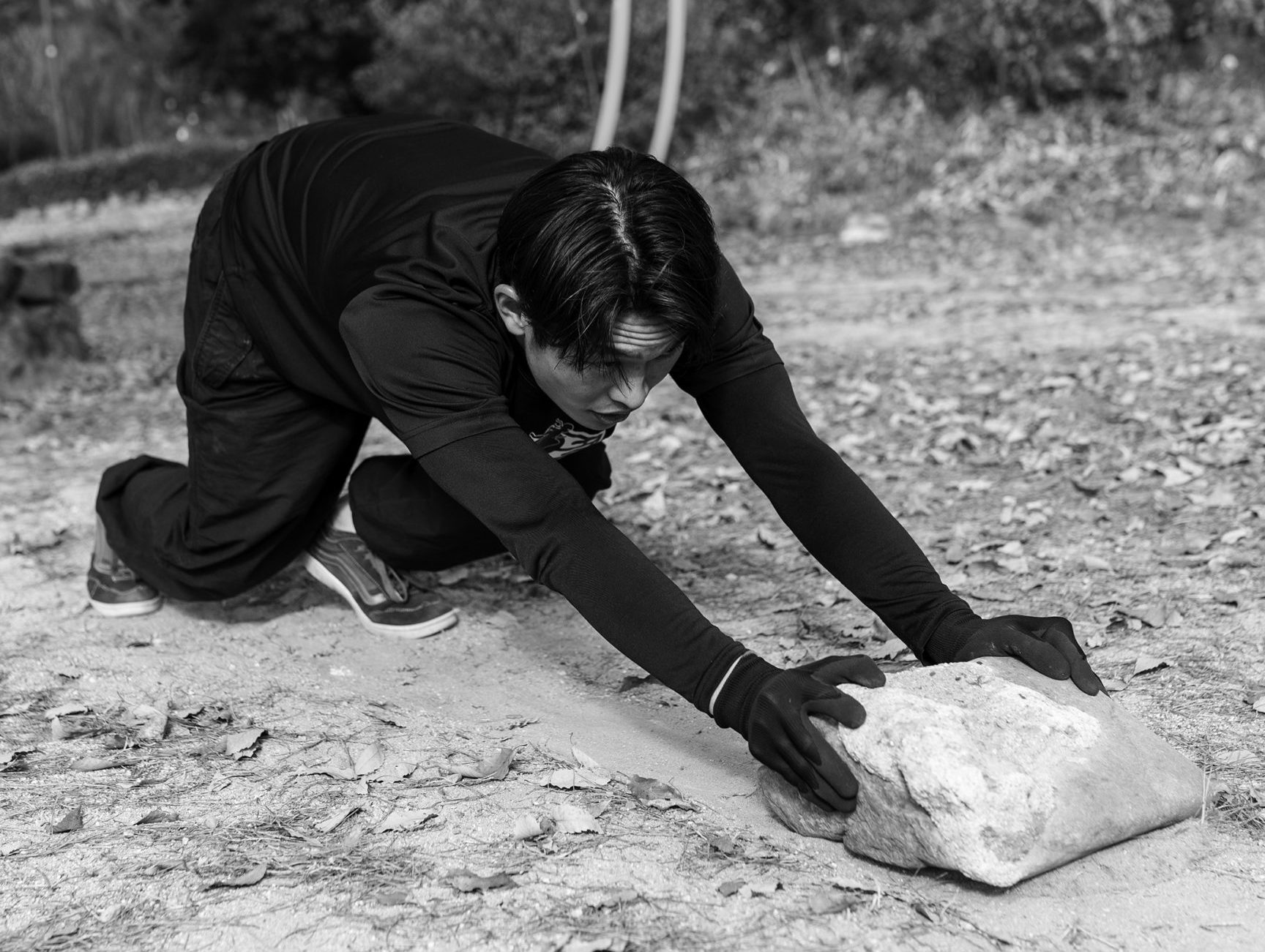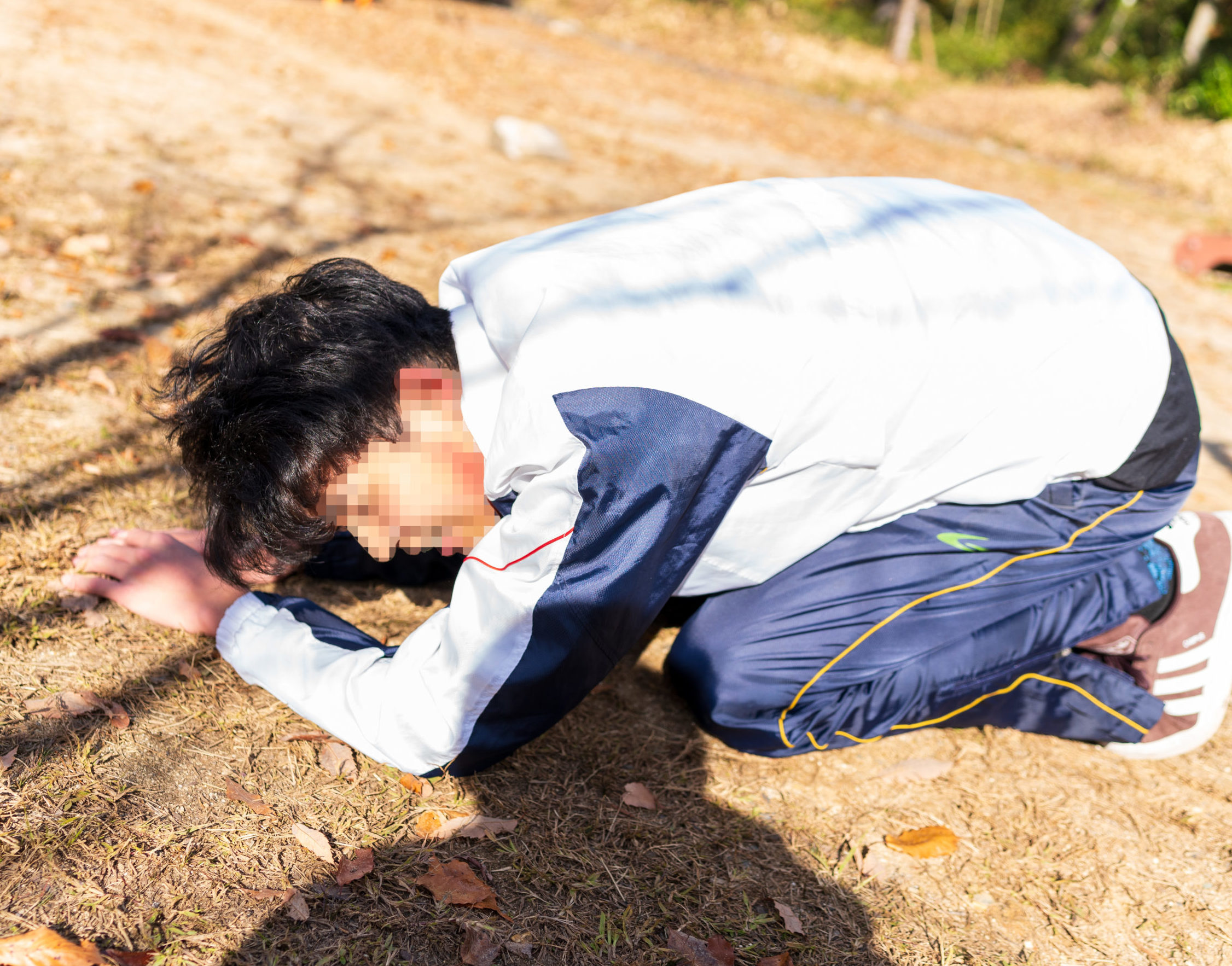 その後、公園に転がる岩を押し、足腰を鍛える。腰を低くしないと体重が十分に伝わらず、岩が全く進まない。やっとの思いで岩を押し切ると次は約10秒、鉄棒にぶら下がった。腕力でなんとかクリアすると、最後は短距離ダッシュで終了。すべてのトレーニングを終える頃には、くたくたになってしまった。