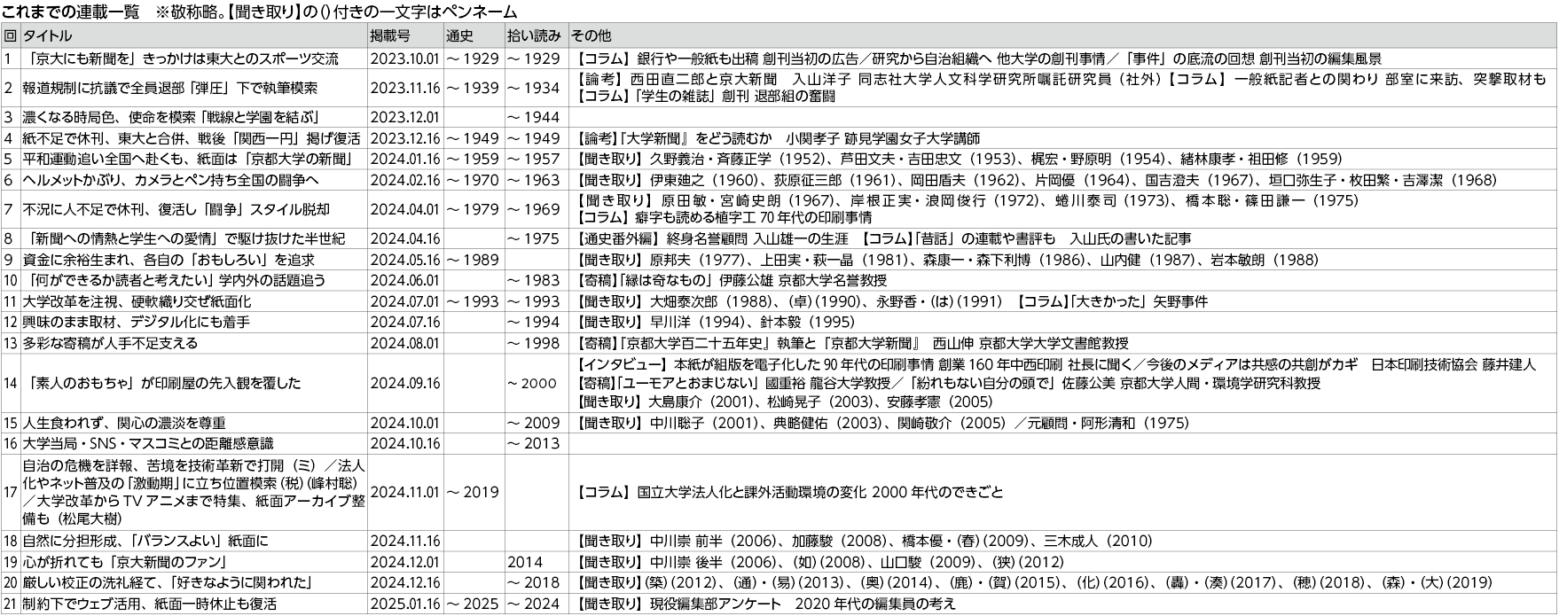 京大新聞の今日に至る道のりは、存続が必然と言えるほど順風満帆ではなく、綱渡りに近い。それでも、綱を渡り続けられてきた要因は確かに存在し、偶然や幸運のみでは片付けられない。おそらく今後も綱渡りが続くと思われるが、着実に歩みが積み重ねられることを祈る。〈了〉