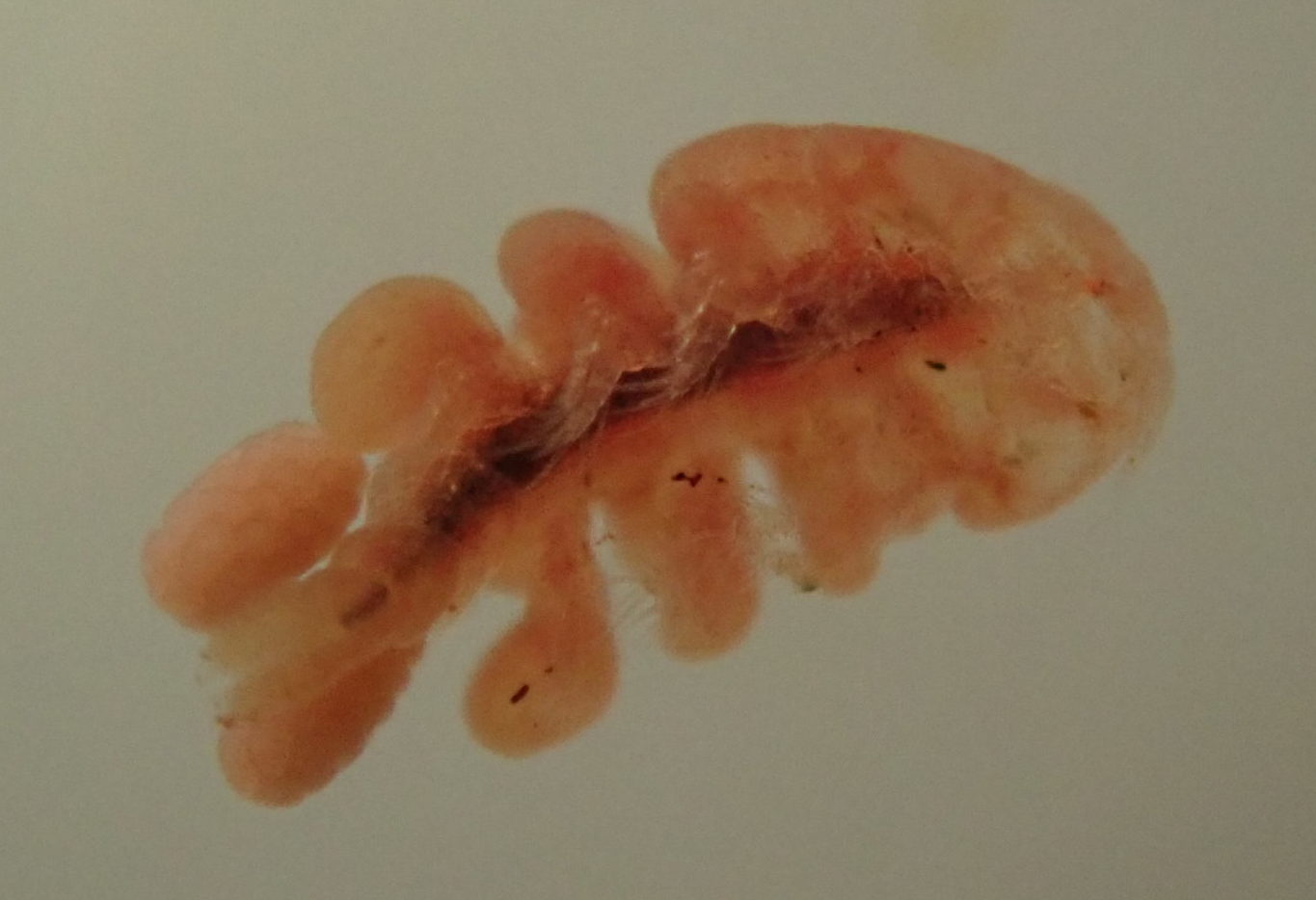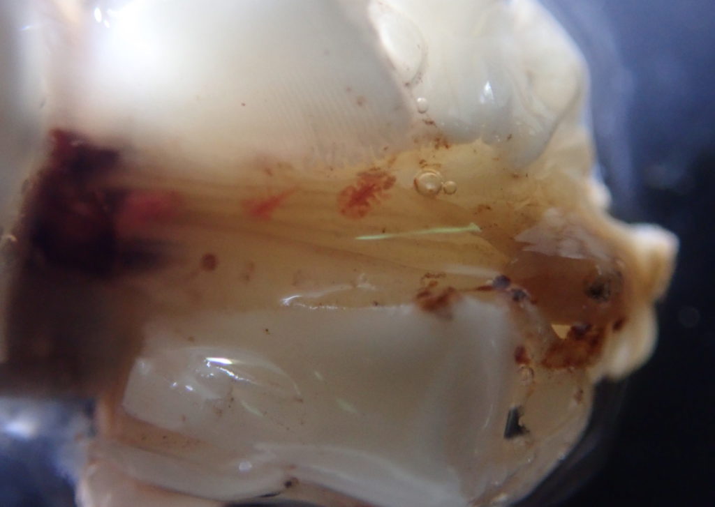 プランクトンの中でも非常に個体数の多いカイアシ類は、一部の種が寄生性で、宿主にくっついたり体内に入ったりします。有毒ウニの寄生者を調べるために、アリストテレスのランタンと呼ばれる口器を割って食道を見たとき、ガンガゼ科のウニから体色の赤いカイアシ類を見つけました。ウニの口器の中に棲むという生態に興味を惹かれ、分類と生態の研究を始めました。カイアシ類の研究者と共同で精査したところ、本種は南半球でしか記録されていない種であることがわかりました。アリストテレスのランタンの中にある、真っ赤なカイアシ類。種火を連想して「ランタンノタネビ」と和名を付けました。