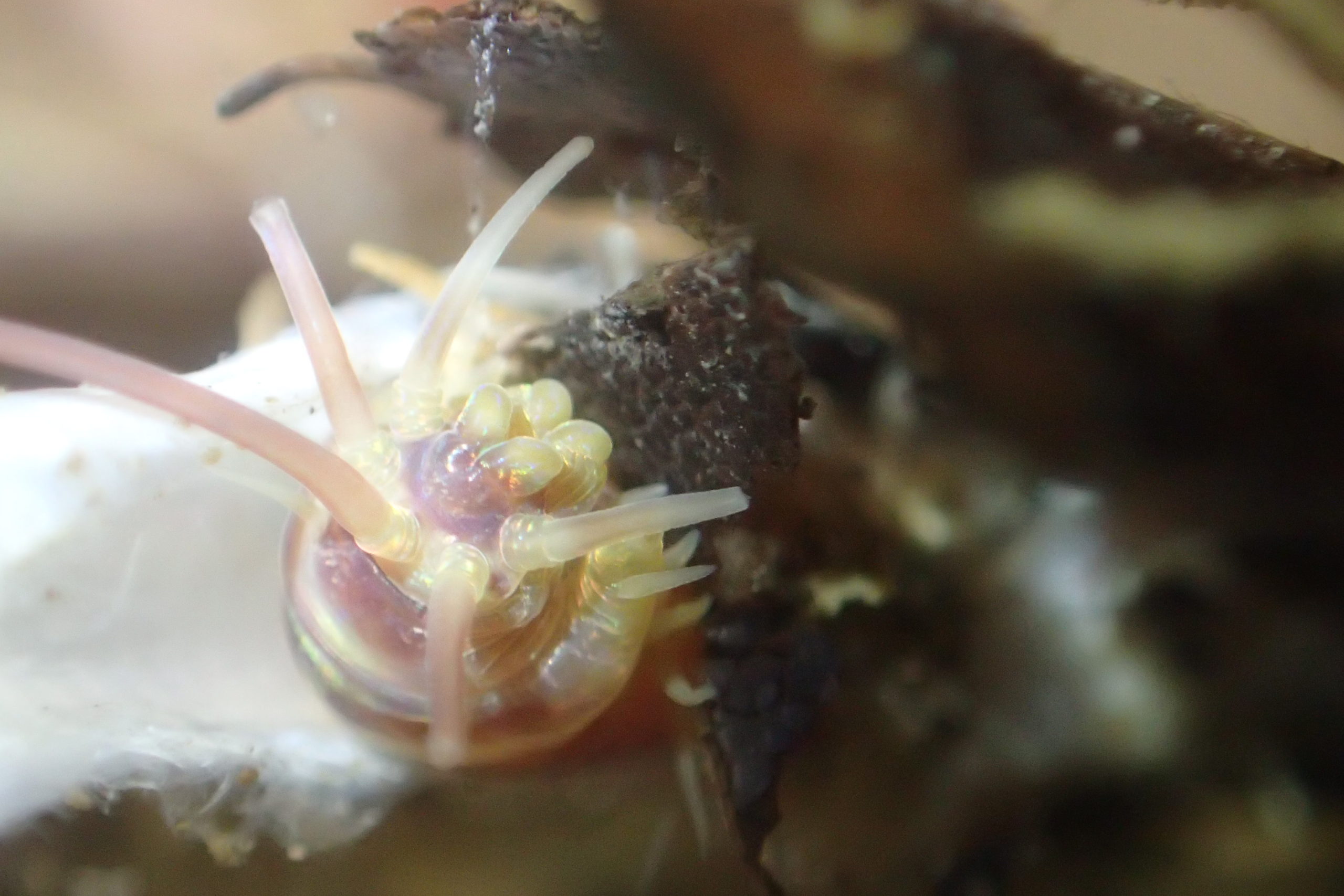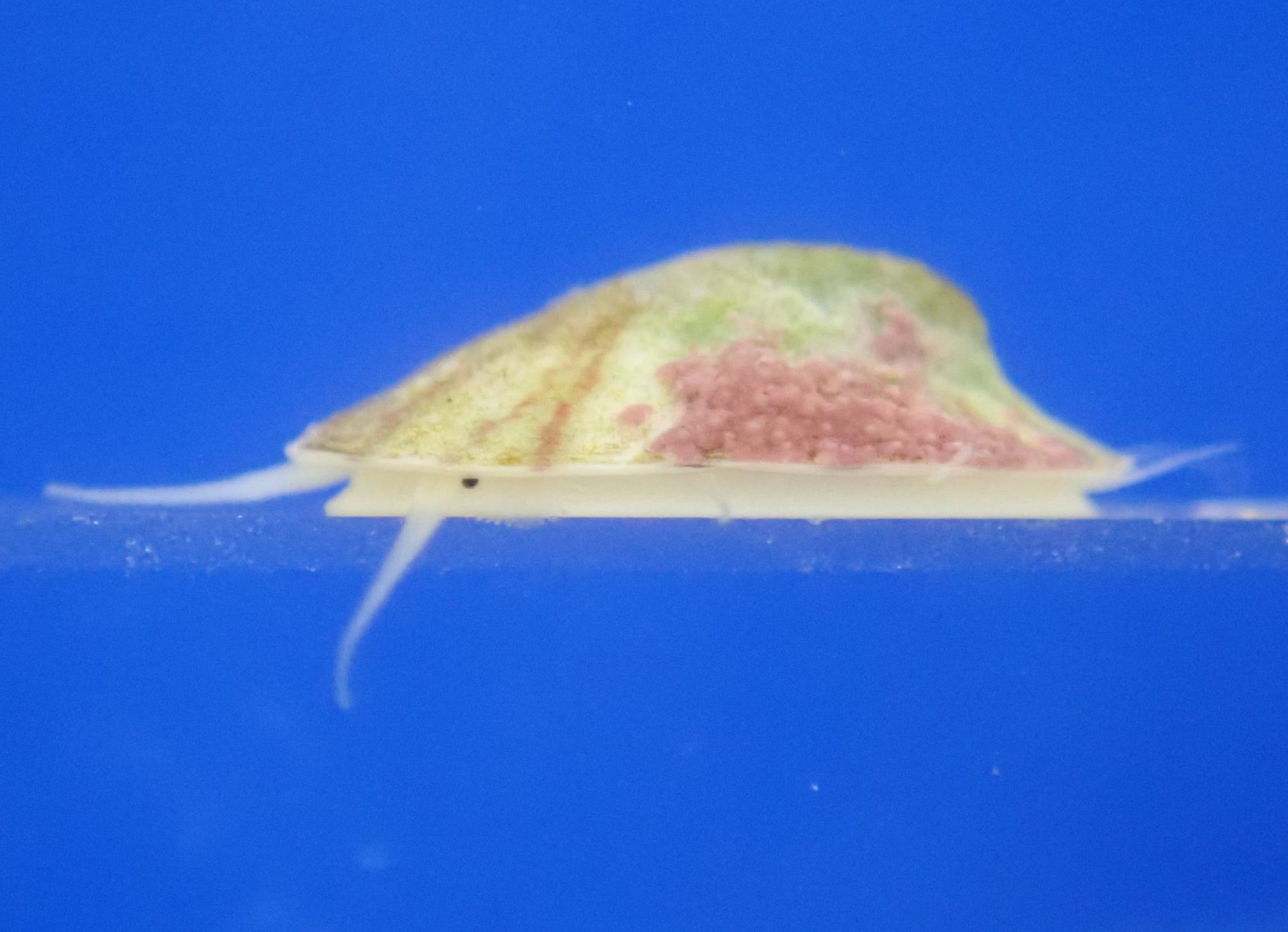 ハナザラの幼生をシャーレの中で孵化させ、穿孔ウニ、二次利用ウニ、ハナザラの成体、ケイ藻を入れたガラスボウルの中で飼育する実験を行ったところ、ハナザラの幼生は、二次利用ウニか同種の成体がいる場合にのみ着底しました。これは藻食性の貝類が宿主を認識して着底する、世界初の例となりました。同種の成体のもとに着底するのは、おそらくその場所がハナザラに適した環境であることが間接的にわかるからだろうと考えています。宿主認識のメカニズムは未解明ですが、ウニ固有の何らかの化学物質を手がかりに認識しているかもしれません。