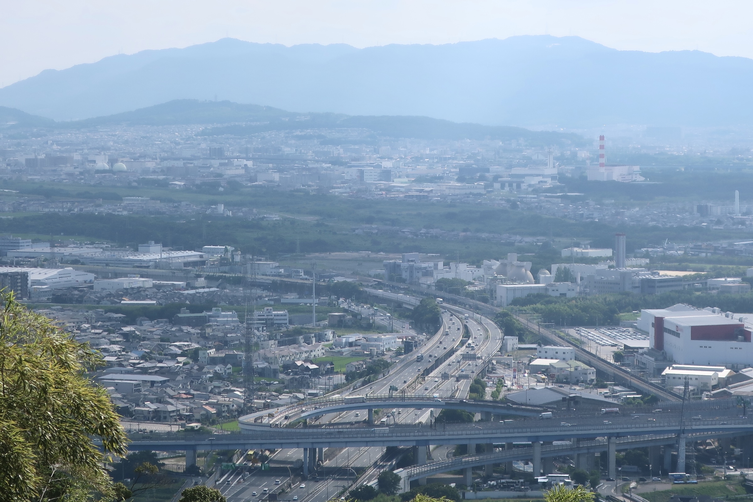 記事の構成を決めたところで山を降りることにした。山頂から下ったところに、旗立松展望台と青木葉谷展望台という2つの展望台がある。旗立松展望台はその名の通り羽柴軍が山崎の戦場に向けて旗を掲げたところで、光秀が布陣した勝竜寺城方面を望む。眼下には淀川・桂川・木津川の3川合流と大山崎ジャンクションを望み、山崎が入京の関門になる要所であることが見て取れる。青木葉谷展望台からは、住宅やマンションが建ち並ぶ北摂の家並みの先に大阪都心を一望できる。日本有数の経済都市に発達した秀吉の城下町を、勝利の地たる天王山から望むというのは独特の感慨がある。