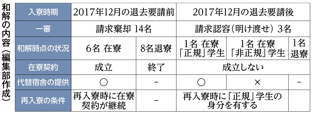 和解条項では主に現棟の耐震工事と、工事に伴う現棟の明け渡しについて定めた。一審被告のうち、現在も吉田寮に居住する寮生8名は、現棟を26年3月末までに明け渡す。京大は明け渡し後「速やかに」現棟の耐震工事に着手し、5年以内に工事を完了する。寮生らは大学が提供する民間の代替宿舎に移るが、工事完了後、8名は学籍などの条件を満たせば、現在と同じ月額400円の寮費で再入居できる(=表)。寮生側の森田基彦弁護士はこの点について「現棟の『寮機能の存続』を勝ち取った」として、大きな成果だと評価した。