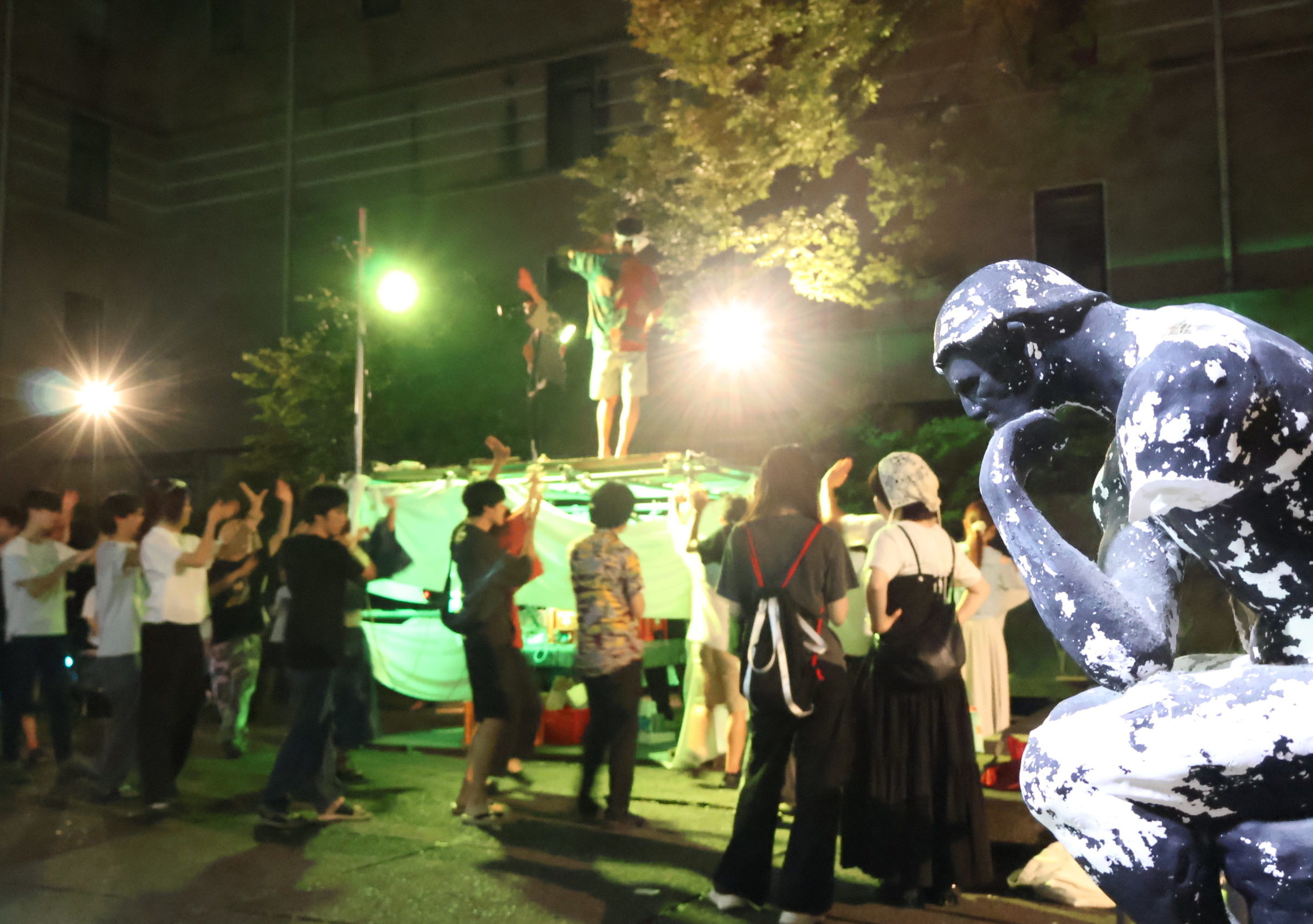8月26日、東館の中庭で盆踊りが催され、約70人が参加した。今回の催しは自治空間移転問題に関心を持つ有志が主催したもので、退去要求に対抗して自治空間の存在意義を顕示することが狙いだ。学友会は東館での今後のイベント開催にも意欲を示した。