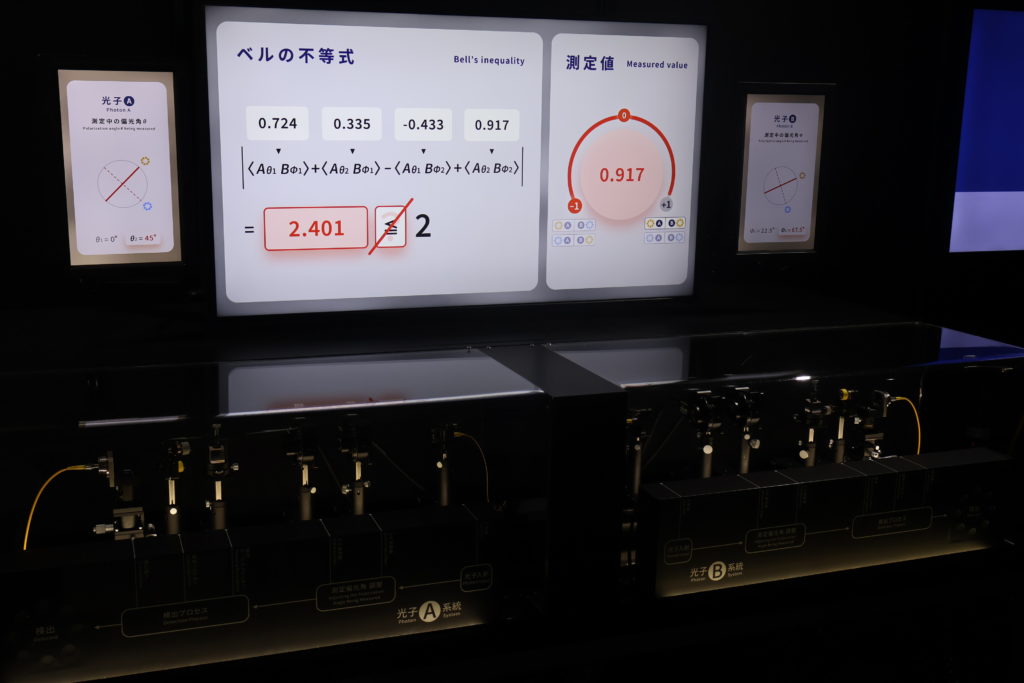 第3の装置が実証するのは「ベルの不等式の破れ」だ。古典物理学の理論は、見ても見なくてもあるものの状態は変わらない、という「実在性」と、ある出来事が遠く離れた別の出来事に影響を与えることはない、という「局所性」の両方が成り立つ「局所実在論」で説明できる——クジを引いても引かなくてもそのクジに書かれた内容は変わらず、また、札幌で引いたクジの結果が、同時刻の那覇でのクジの結果に影響を及ぼさないように。この局所実在性が成り立つ場合、「ベルの不等式」も成り立つとされている。ところが量子力学の世界では、この不等式が成り立たないことが実験によって証明されたのだ。岡本准教授によると、この実験を一般向けに展示するのは、知る限りでは世界初だという。
