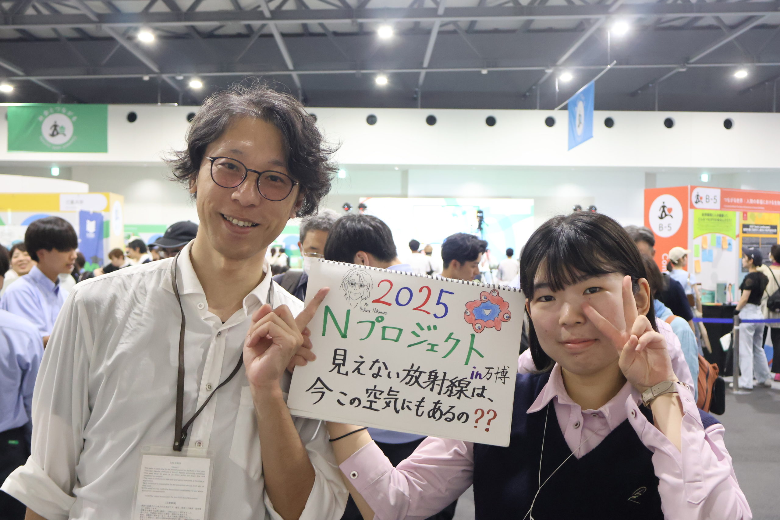 複合原子力科学研究所の中村秀仁助教が、私立大阪高校(大阪市東淀川区)と協働しているプロジェクトがある。中村助教の名字にちなみ、同高校の教頭が名づけた、その名も「Nプロジェクト」。生徒たちは中村助教の専門分野である放射線科学の知識を学んだ後、自らの興味関心に従って自学自習を深める。その成果を自作のスケッチブックにまとめて、近隣住民や小中学生、時には街行く人に向けて語りかける。万博でも来場者に向けて、同様の活動を実施した。