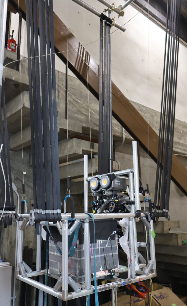 ところで、映像はどうやって制作したのだろう。後日、京大構内の土佐研究室を訪れ、制作装置を見せていただいた。装置は高さ4㍍ほどで、中央にはアクリルボックスで覆われたスピーカーが吊り下げられている。制作の際は、スピーカーの上に絵の具を載せ、めいっぱいの高さまで上げてから、下へ一気に落とす。すると箱の中で、重力が極めて小さくなる「微小重力状態」が疑似的に発生し、絵の具がふわりと跳び上がる。この一瞬を映像に収めたのが「サウンドオブ生け花」だそうだ。土佐特定教授は本作品を、日本文化をコンピューターを使って表現する「カルチュラルコンピューティング」の一環として制作したという。