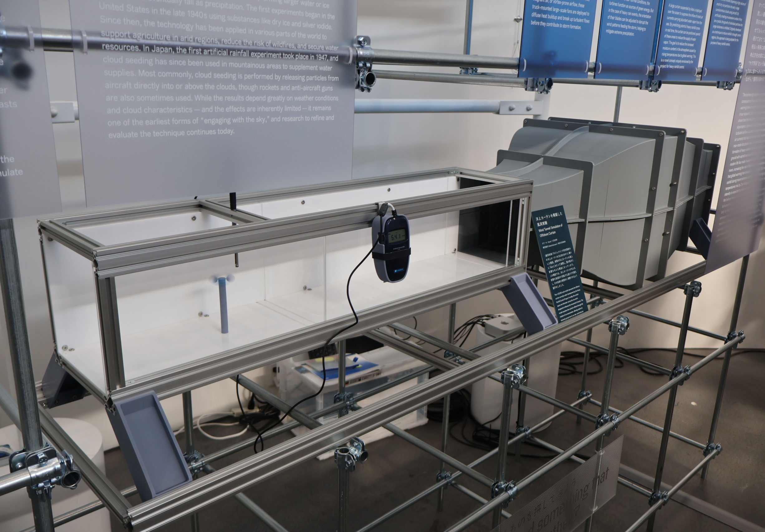 山口教授に展示を案内していただいた。展示で紹介された技術は、雨雲発生の原因になる上昇気流を抑制する「増風機」や「風車」、ドライアイスなどの微粒子を積乱雲に散布し、雨雲の成長を抑える「クラウドシーディング」などの4つ。中でも詳しく紹介されていたのは「洋上カーテン」だ。雨雲は水蒸気を取り込んで大きくなっていくため、水蒸気の供給を抑えれば雨雲の威力は弱まる。そこで海上の船から凧を揚げ、その凧からメッシュ状のカーテンを吊るすことで、水蒸気の供給を抑え、雨雲の成長を抑制することができるという。また、雨雲の発生地点から離れた場所で洋上カーテンを吊るす場合、単なる布よりもメッシュ状の布の方が水蒸気の供給抑制に効果がみられることが、実験装置で紹介されていた。