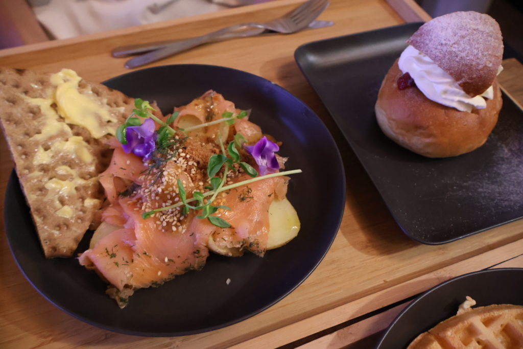 空いているパビリオンを巡るうちにすっかり日が落ちた。お腹もすいてきたので北欧館で夕食にすることに。主菜にサーモンマリネ、デザートに北欧発祥の菓子パン「セムラ」を頼んだ。白味噌で和風に仕立てたサーモンは脂がのっているがくどくなく、粒マスタードともよく合う。カルダモンを練り込んだ生地にホイップクリームとラズベリージャムをのせたセムラは、さわやかな甘さでお口直しにぴったりだ。