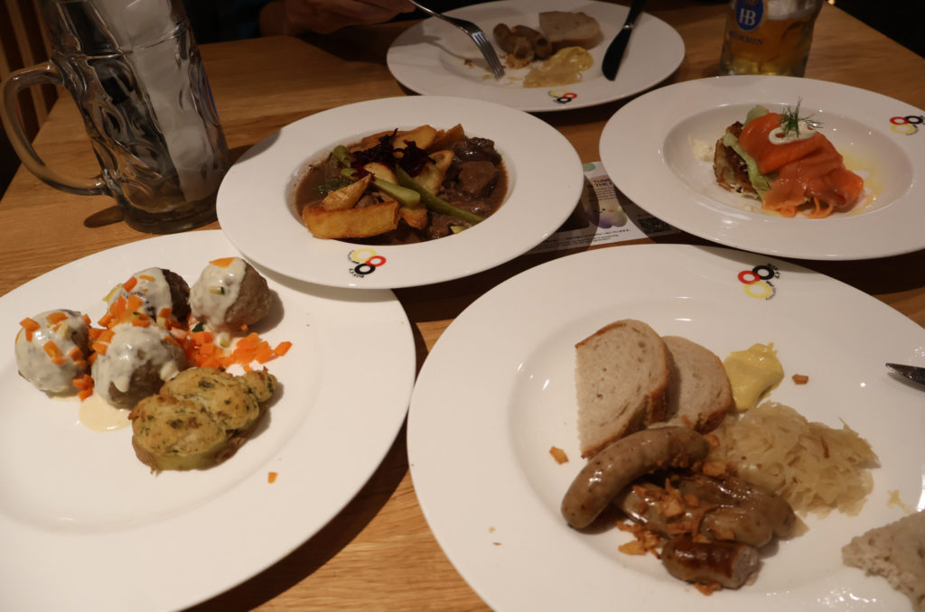 「何が何でも夕飯は海外の料理を」。最後の取材を終えた後、その執念からドイツ館のレストランに続く行列に並んだ。思いのほか行列は早く進み、ものの20分ほどで入店することができた。ドイツビール、ウインナーの盛り合わせ、肉団子にホワイトソースをかけた東プロイセンの郷土料理「ケーニヒスベルガー・クロプセ」など、ドイツならではの料理はどれも絶品だった。特に、牛肉の赤ワイン煮込みは、食べた瞬間に牛肉が舌の上でとろけ、赤ワインの香り漂う濃厚なソースが口の中いっぱいに広がり、感動すら覚えた。会計時には、桁違いかと目を疑ってしまったが、その値段に見合った料理だと言えるだろう。総じて万博ならではの体験だった。(郷)