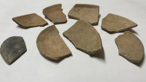 注目2→岩倉の古代鉄生産に関わる遺跡です。昨年度から本格的な調査を始めました。当遺跡を木野芝遺跡と称し、遺物を拾い、測量を実施しました。これまで、岩倉は須恵器・瓦生産を行う古代の窯跡が多く調査され、「岩倉古窯跡群」と呼ばれるほどの一大生産地として考えられてきました。しかし一方で、ほかの手工業生産の実態はあまり知られていません。このような状況のなか、木野芝遺跡では鉄生産に関わる遺物を採取したため、岩倉における鉄生産研究を進めるべく展示・報告をしています!