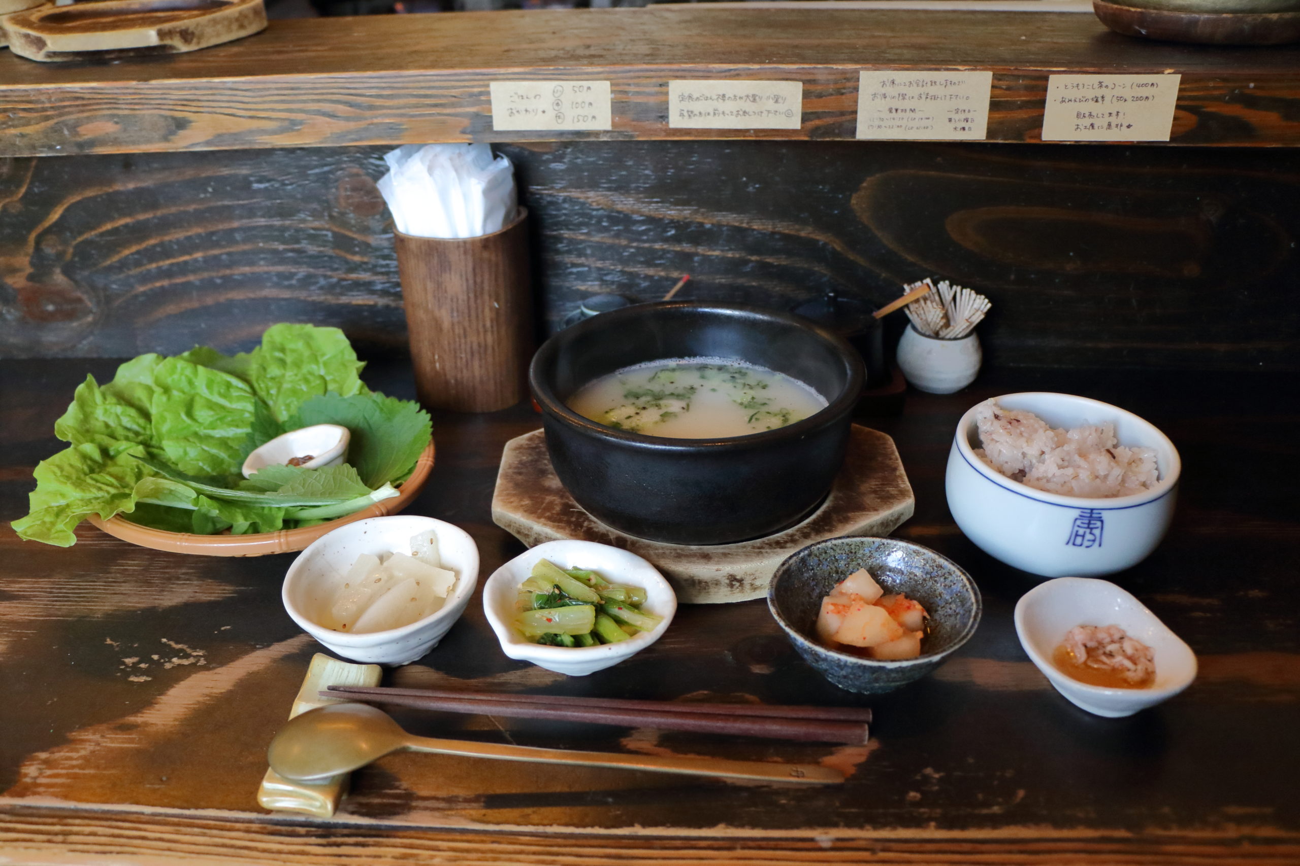 メニューはスープ料理を中心に5種類ほど。韓国料理と聞くと辛いものを想像しがちだが、優しい味つけのものが多い。今回注文したのは「ソルロンタン定食」1300円。牛のすね肉や骨を煮込んだスープは非常にあっさりとしており、塩コショウやアミエビの塩辛を使って好みで味付けができる。定食にはスープのほかご飯と3点のおかずがつく。プラス200円で包み野菜も注文可能だ。
