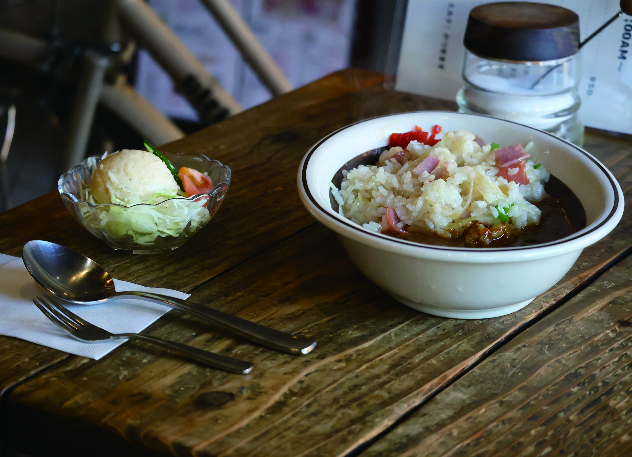 名物は焼き飯カレーだ。焼き飯にはベーコンや玉ねぎが入っていて、優しく甘い。甘口のルーは、酸味や辛味、甘味のバランスが良いのか、立体的に味わい深い。ルーの仕込みには3日をかけるという。1日目に鍋で鶏ガラを8時間以上煮こみ、2日目に炒めたじゃがいもやにんじん、牛肉を入れる。その後、甘みを出すために1時間炒め続けた玉ねぎを投入し、ニンニクや醤油、酒、ケチャップを隠し味に仕上げる。白米ではなく焼き飯なのは、バイトの人がまかないの焼き飯にルーをかけて美味しそうに食べていたことに由来する。食事・内装と様々な要素が、コーヒー豆をブレンドするように丁寧に組み合わされている。