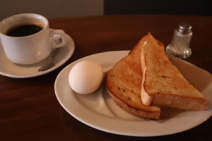 朝一番の空腹に耐えかねて、モーニングを注文した。朝日に照らされたトーストとゆで卵が、白い皿の上に綺麗に並ぶ。トーストは、食感もさることながら、噛むごとに伝わる甘みが楽しい。ゆで卵は絶妙な半熟加減で、塩を振らなくても黄身にコクがあって味わい深い。コーヒーは江沢さんの好みに合わせて深煎りにしているそうで、苦みをじっくり堪能できた。