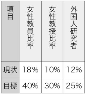 京大は、国際化や多様性の推進も図る。50年度末までに、外国人研究者を25%とするほか、また、女性教員の割合を40%、教授職の女性教員の割合を30%とする目標を掲げた。(=表2)