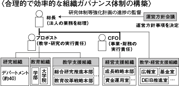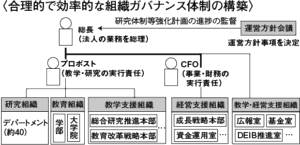 また、法人の意思決定の最高責任者である総長、研究・教育の実行責任者であるプロボスト、事業・財務の実行責任者であるCFOの三者の「責任と権限を明確化した新たな組織ガバナンス体制の構築」も行うという。プロボストが研究組織、教育組織、教学支援組織を統括する。CFOは成長戦略本部などの経営支援組織、総長はDEIB推進室などの教学・経営支援組織を統括する。(=図3)
