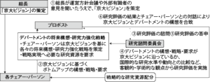 デパートメントの将来構想や戦略は、総長が運営方針会議や外部有識者の意見を聞いて策定する「京大ビジョン」が基礎となる。(=図2)デパートメントの長は、京大ビジョンに基づき構想を考え、教学の責任者であるプロボストに必要な研究資源を要求する。新たに設置する「研究諮問委員会」が、「客観的・学術的な観点」から、研究評価を実施。評価をもとにプロボストがデパートメントの長と協議し、「戦略的」に研究資源を配分する。