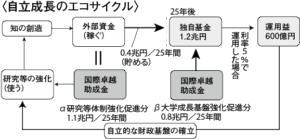 さらに、事業終了後も持続的な成長のために必要な運用益を生み出せる規模の大学独自基金を作ることも必要となる。京大は、独自基金の運用益で大学ファンドから得られる助成額と同等の独自収入を事業終了後も生み出す計画を示している。運用益600億円を利率5%で達成するには、独自基金として1.2兆円が必要となる。独自基金1.2兆円を作るために、外部資金からの0・4兆円と国際卓越助成金を元手とした0.8兆円を充てる予定である。