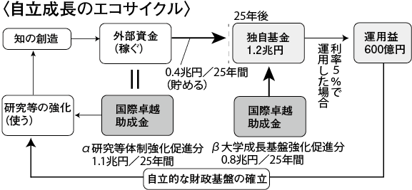 政府は、大学の国際競争力の低下や財政基盤の脆弱化という現状を変え「大学を中核としたイノベーション・エコシステム」を構築するため、世界レベルの研究基盤の構築のための大胆な投資を実⾏するとして、文部科学省が所轄する「科学技術振興機構(JST)」に大学ファンドを設置し、21年度末に運用を開始した。毎年、運用益から年間3千億円を上限として、卓越大へ最長25年間助成を行う。