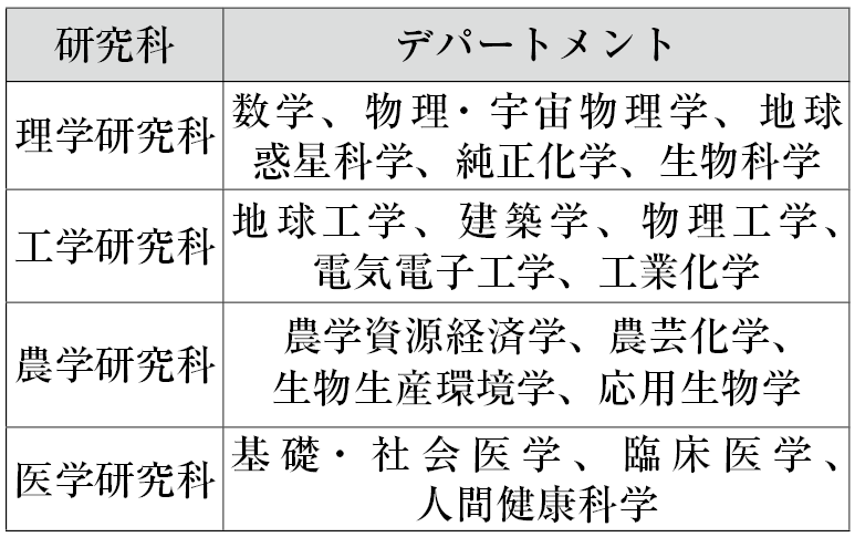 29年4月までに導入するデパートメントは、2016年から運用する「学系」の単位をベースに区分する。現行の学系は、教育人事組織として採用や昇進などを担い、人文社会学域の6学系、医・薬学域の5学系、自然科学域の26学系、学際学域の2学系の合計39学系を基礎とする。18の研究科との対応を見ると、文系では複数学系への分割はない一方、理学研究科と工学研究科は各5学系、農学研究科は4学系、医学研究科は3学系に分割される。(=表1)附置研究所の扱いについて、阿曽沼氏は、研究所としての役割を果たしつつも、29年度時点では基本的に各附置研究所が1つのデパートメントへ移行すると述べた。