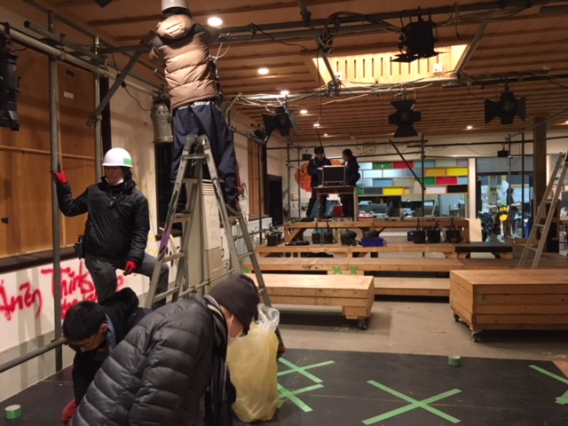 まず吉田寮食堂は現在、文字通りの食堂としての機能はなく、ライブや演劇を催すイベントスペースとして活用されていて、我々劇団愉快犯も使用していいます。単管という金属のパイプみたいなものがありまして、写真にあるように、脚立使って、舞台を組んで作ります。劇団が使う小屋については、劇場やスタジオでは、最初から形や配置が決まっていますが、一方で寮食堂はなにもないので、労力と時間をかけさえすれば非常に自由な舞台づくりができる上に、費用もかかりません。費用がかからなければ、浮いたお金でいろんな挑戦ができるので、文化活動や芸術活動の面から見ても、吉田寮は重要な拠点であるといえます。しかし、現在、吉田寮に退去通告が出されており、イベントスペースである食堂も、取り壊されはしないかもしれませんが、どう使われていくのか分からない状況です。食堂使用者という立場から、管理強化に反対するというか、困っているということを伝えました。