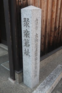 二条城から北に1・5㌔、中立売通の民家の軒下に「聚楽第址」の碑がある。聚楽第は、正親町天皇のもとで1585年に関白の職についた秀吉が、86年から87年にかけて建築した城郭風の邸宅だ。敷地の広さは東西3百㍍、南北4百㍍ほどと推定され、西濠址にも石碑がある。大徳寺唐門や西本願寺飛雲閣はその遺構と伝えられ、桃山文化を象徴する豪華な建築であった。
