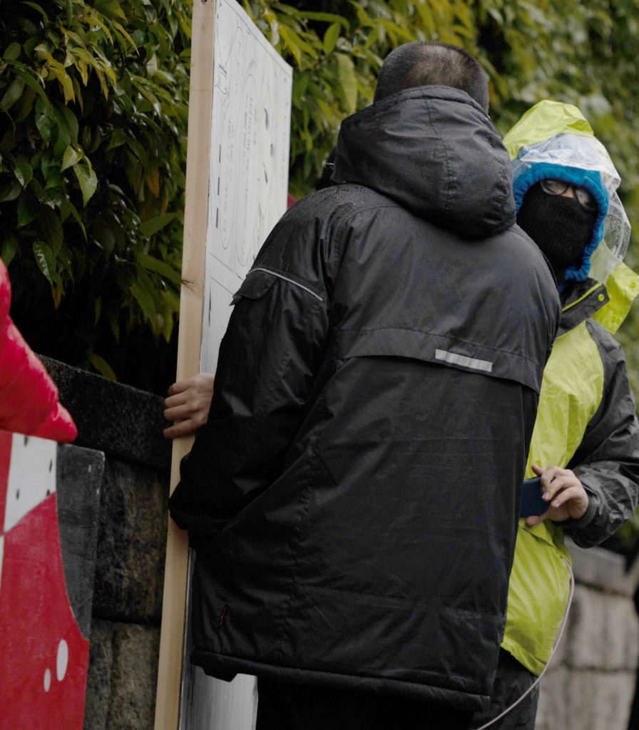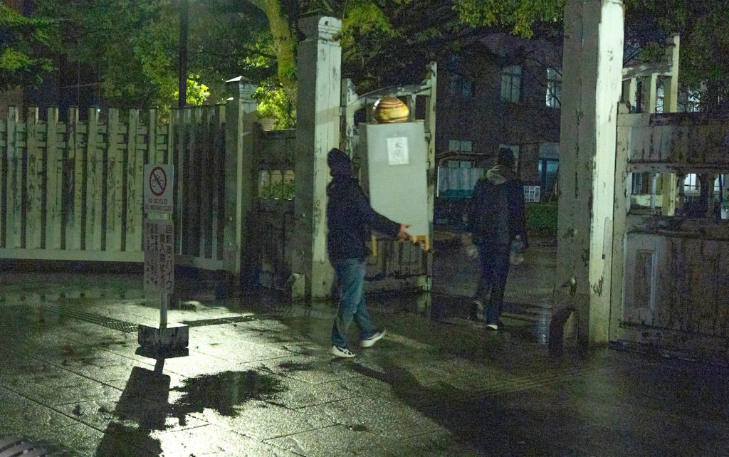 夜が明けた。設置に携わる学生が再び集合し、点呼が行われる。配置や人数の変更を確認し、職員に身元を把握されるのを防ぐため、サングラス、マスク、ネックウォーマーなどで変装する。あいにくの雨天だが、タテカンを運ぶ際に傘はさせない。ゴミ袋が支給され、頭の部分を切り抜いてレインコート代わりに着用する。