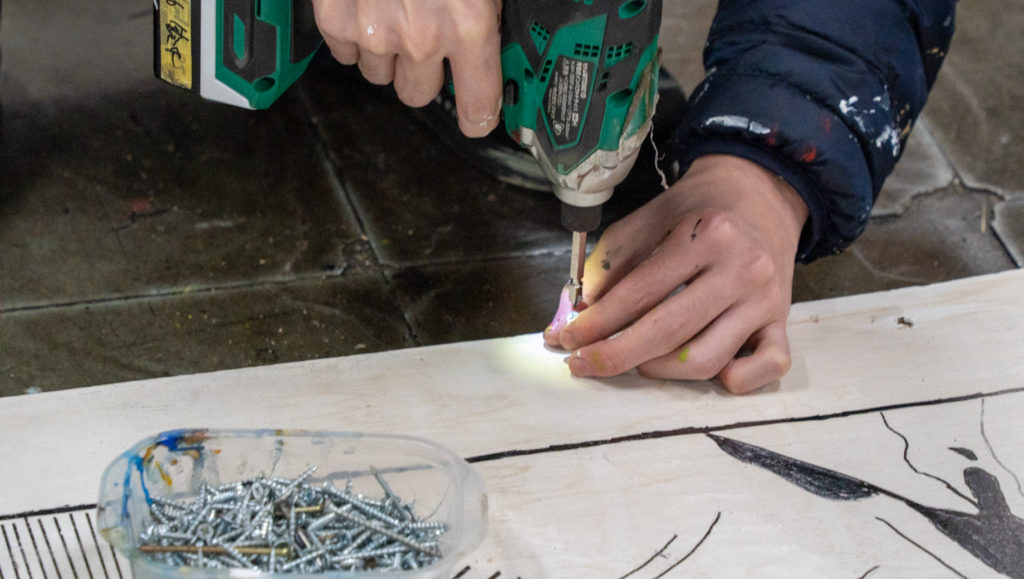 作業場に学生たちが戻ってきた。最終工程として、ベニヤ板の裏に木枠をネジで固定していく。
