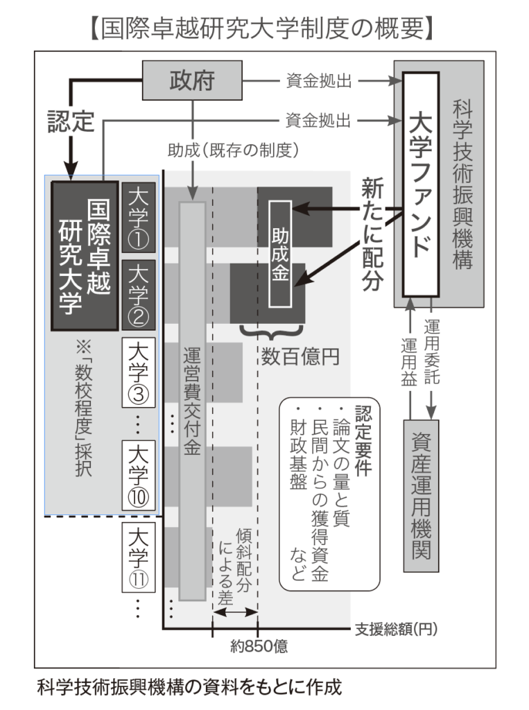国際的に卓越した研究を行い、社会に変化をもたらす研究成果が期待される大学を国が「国際卓越研究大学」に認定。大学が作成する体制強化計画に基づき、10兆円を運用する「大学ファンド」が1年あたり最大で数百億円を拠出し「世界と伍する」研究大学の形成を目指す。その一方で、認定された大学は大学ファンドの元本維持・増強のための資金拠出や、年間3%の事業成長を求められる。また、学外者が半数以上を占める総長の人事権を持つ合議制機関の設置など、制度改革も課される。