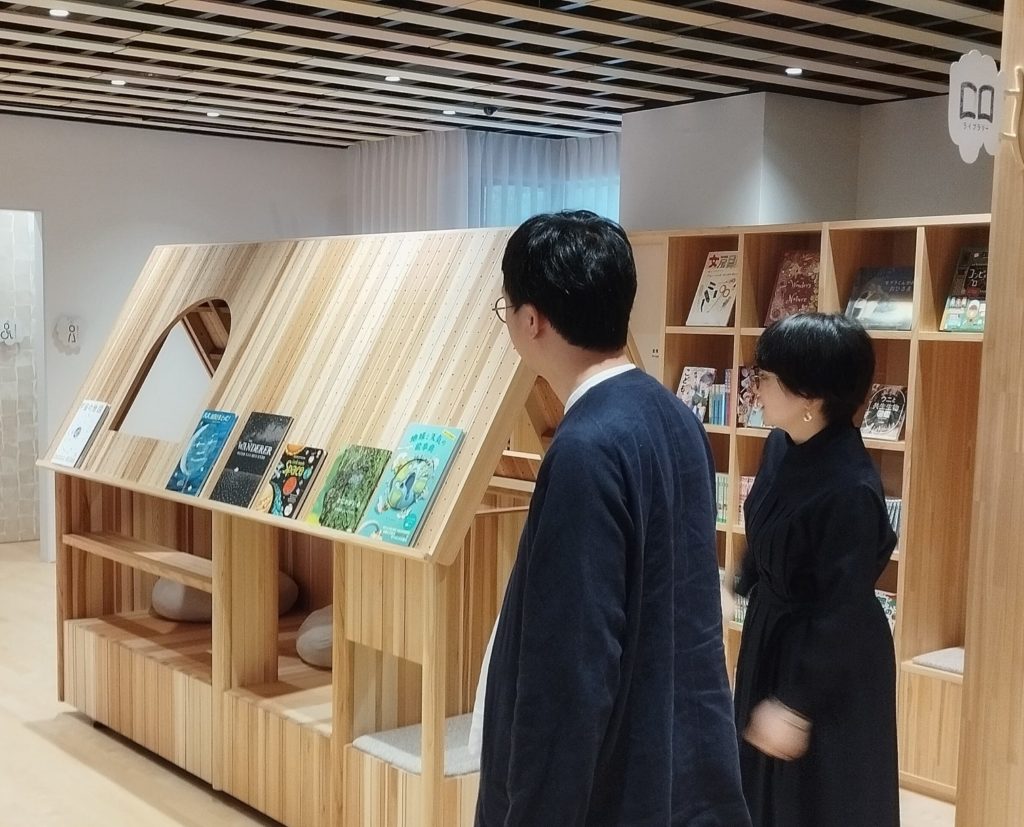 開所前の会見で家具の設計を説明する建築士