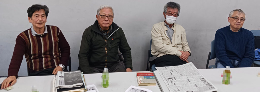 左から原田敏さん(1967-71)、宮崎史朗さん(1967-71)、浪岡俊行さん(1972-77)、蜷川泰司さん(1973-80)=3月10日、京大西部共用室にて