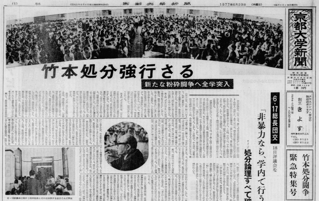 しかし、77年からはじまる第2次竹本処分粉砕闘争が、キャンパスを再び燃え立たせる。この年の2月、京大評議会は竹本助手の分限免職をめぐる審議を再開した。就任直後に「理解を深めたい」として議論を凍結していた岡本道雄総長が、懸案解決に乗り出したのである。京大新聞は2月16日号のニュースで、「総長岡本はとうとうその本性を現し、欠席密室審査による処分強行を図ってきた」と警戒し、「不当なデッチ上げ政治思想弾圧」と批判した。3年前の処分粉砕闘争から時は流れ、学生の大半は竹本氏に会ったことすらない。それでも、その処分は学問・思想の自由に関わるもので、戦前の「滝川事件」の再来と受け止められた。同学会は再び闘争の狼煙を上げ、文・農・経済・教養の各学部が相次いで抗議のストライキに入った。