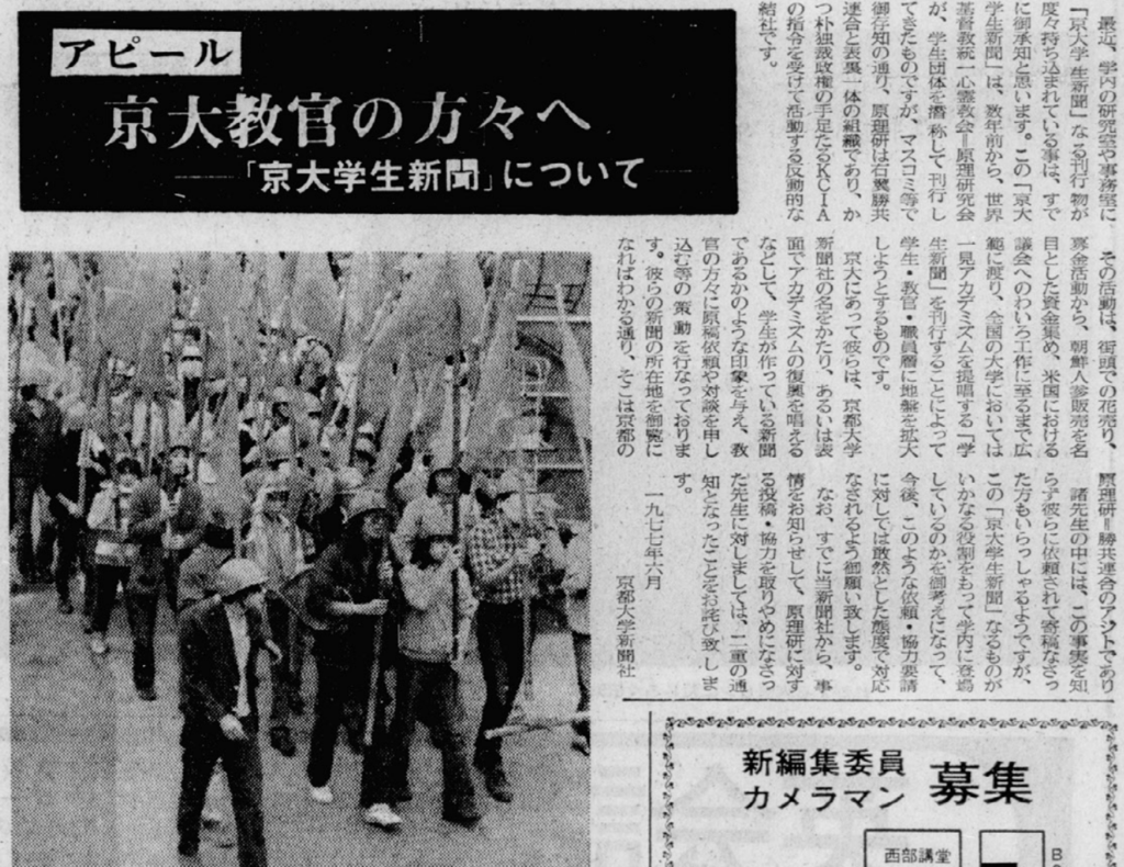 京大新聞の編集員は、ヘルメットをかぶって各地に赴き、紙面で連帯を訴えたほか、闘争委員会の担い手にもなった。70年代にかけて全国に消耗の雰囲気が漂うなか、編集部は、くすぶる学内外の問題に加え、団体運営の課題と向き合うことになる。