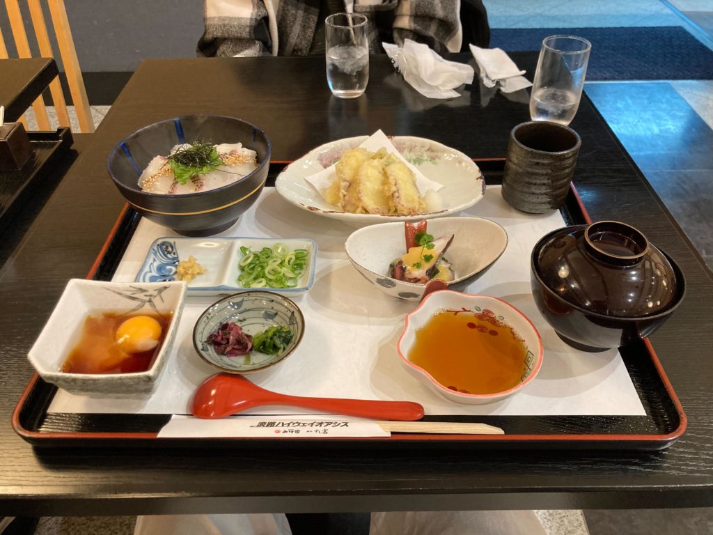 甘く冷たいジェラートを楽しんだあとは、お待ちかねの夕食だ。ついでにお土産も買ってしまおうという魂胆から、淡路サービスエリア内のレストランで食べることに。メニューを開くと、しらす御膳や玉ねぎ御膳、生さわら丼など、淡路島の特産品を使った料理がずらりと並んでいて目移りが止まらない。筆者は「淡路島産蛸と鯛めし御膳」を頼んだ。蛸の天ぷらも鯛めしも美味だったが、お気に入りは副菜の蛸の酢味噌和えである。商店街で明石焼と蛸めしを食べた筆者にとってこの日3度目の蛸であったが、この蛸が群を抜いて美味しかった。