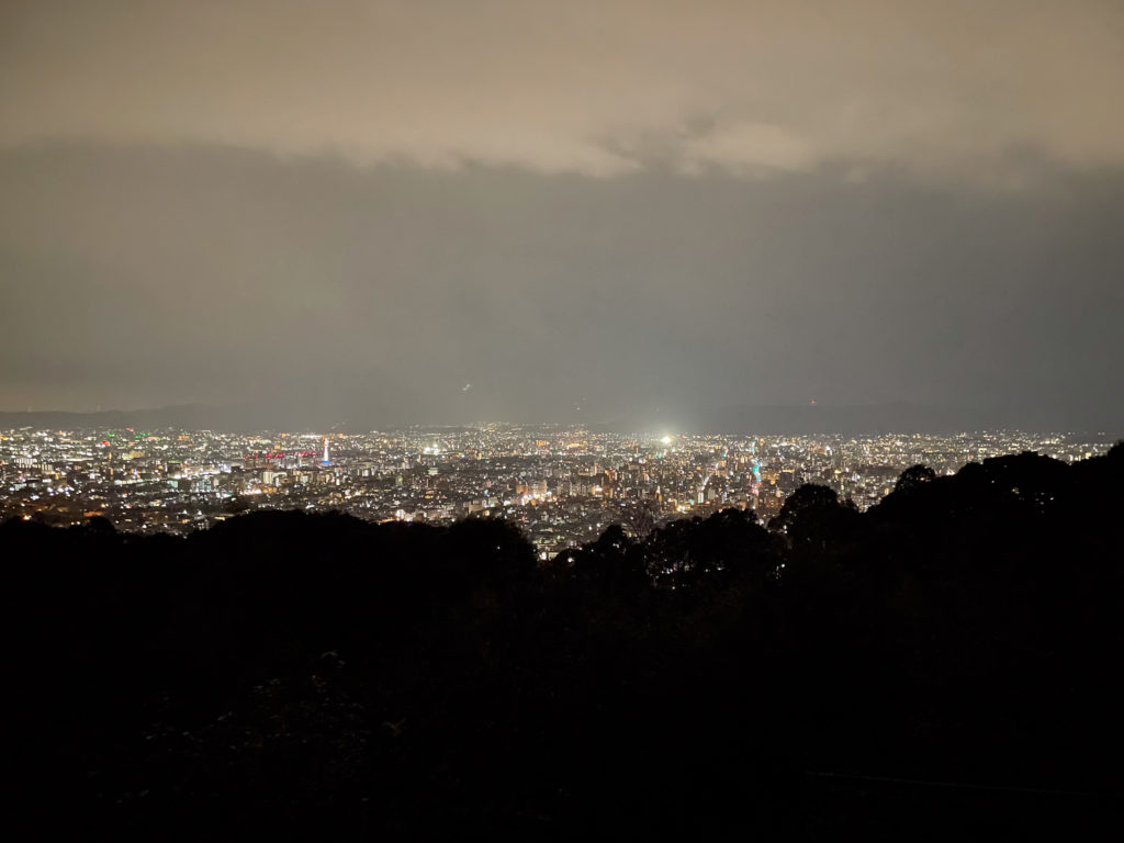 山を降り、高速に乗った後しばらくして、ドライバーの爽がナビの案内を切った。車は、往路で利用した京都南ICを通り過ぎ、京都東ICへ。かつての東海道を追うように、山科から京大へ帰る道すがら、なぜか大通りから逸れた。「このまま終われんでしょう」と爽が笑う。爽は、夜景のリベンジを果たすため、京都の夜景の名所「将軍塚」に向かうと明かした。曲がるところを間違えるハプニングもあったものの、車はすぐに将軍塚に着いた。足元には、「ニデック京都タワー」に生まれ変わる京都タワー。遠くには、ランプが等間隔に並ぶ名神高速が見えた。京都盆地を一望でき、光の一筋もない掬星台の比ではなかった。身近なところに幸せはあるのだと、少し普遍的なことに思いを馳せながら、旅は静かに幕を閉じた。(扇)