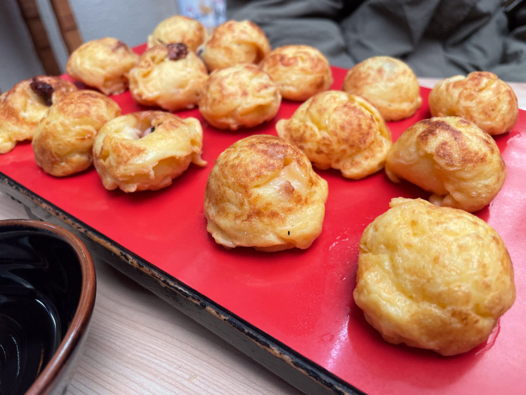 京大を出発して、まず兵庫県明石市にある魚の棚商店街に向かった。シャッター街化した商店街も多い昨今だが、ここは違った。入ってすぐ、行き交う人と頭上でなびく幕の多さに驚愕。思わず声が漏れた。「いらっしゃい」。威勢いい声が飛び交う道を進み、商店街の端にあった玉子焼屋で休憩することに。この玉子焼とは、卵を使ったふわふわの生地にたこが一切れ入った明石の郷土料理で、明石焼とも呼ばれる。出汁で頂くのが特徴的だ。6人で30個を瞬く間に完食した。