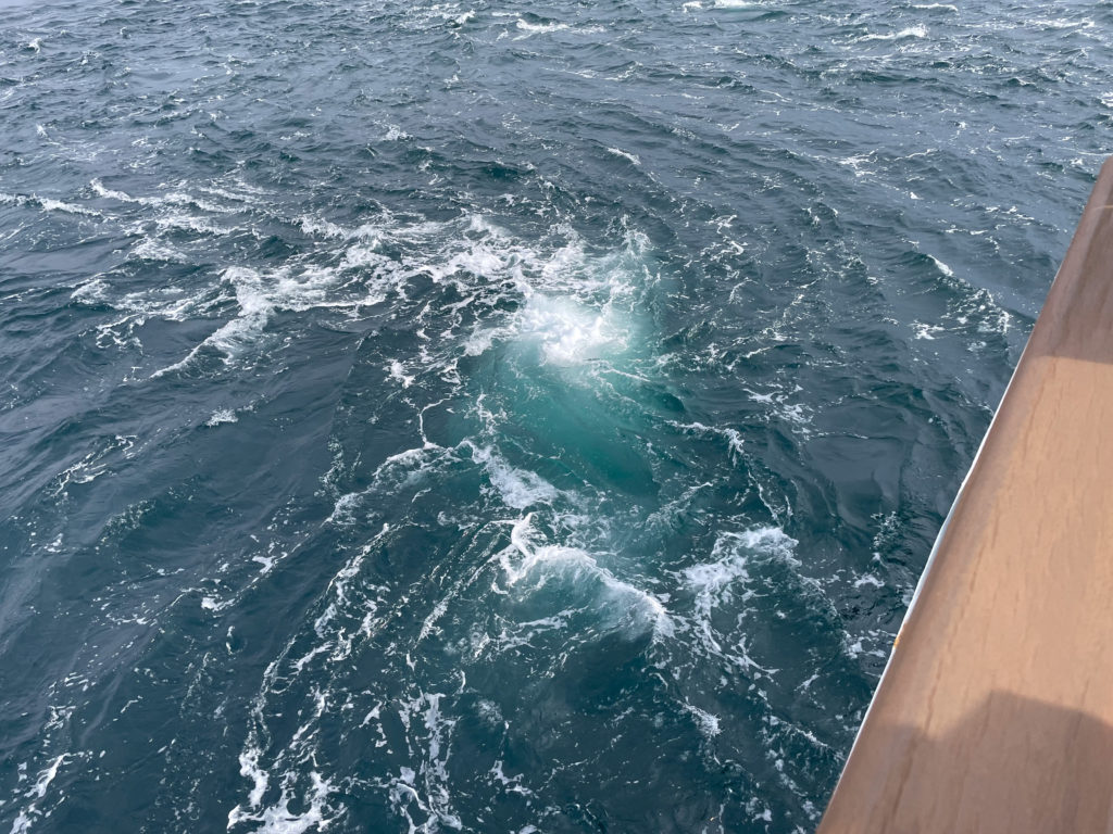 船は、うずしおが発生する大鳴門橋の下へ。デッキに立つと、波が力強く打ち付ける様子を間近で見ることができる。強い風が吹きつける中、海の迫力を体感しようと目的地に着くまでデッキで過ごした。うずが巻く場所に近づき、一行はうずの巻く場所を一生懸命探したが、目に入るのは小ぶりのうずばかり。他の日に来ていたら大きなうずを見ることができたかもしれないと後悔が残った。