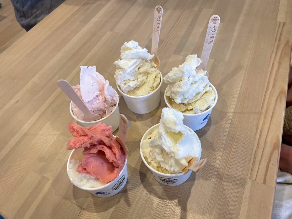 船を降りた後は、扇の希望によりジェラートを食べに行くことに。編集員は、徳島産の材料を使用した色とりどりのジェラートから好きな味を選ぶ。筆者の選んだ味は徳島県産のかぼすとイチゴベリー。どちらも口溶けが良く、酸味と甘さのバランスがちょうどよい。海で苦い思いをしたあとだったからか、ジェラートの甘さがしみた。(史)