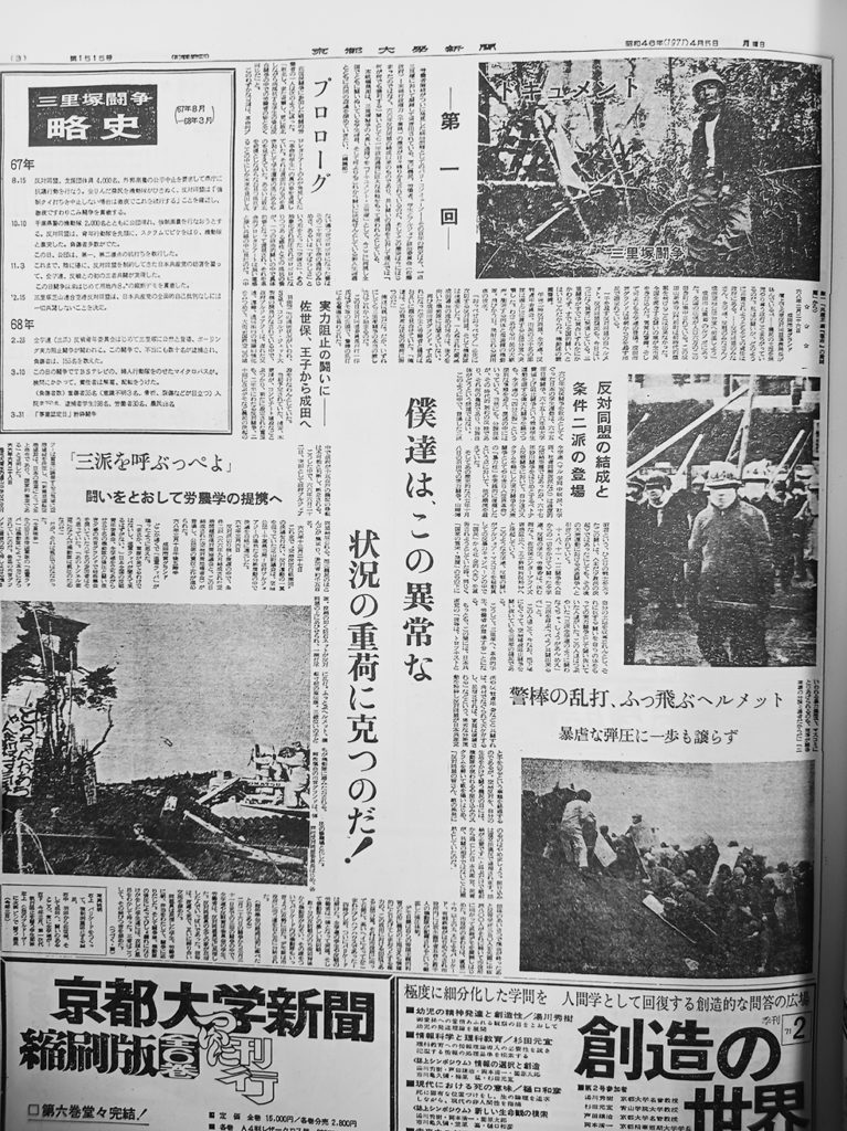 今回は70年1月〜75年5月の休刊まで掲載。この約4年強は、週刊発行で号外3号を含む274号を出した。京大に限らず全国の市民運動を報じている。(以下、記述抜粋)