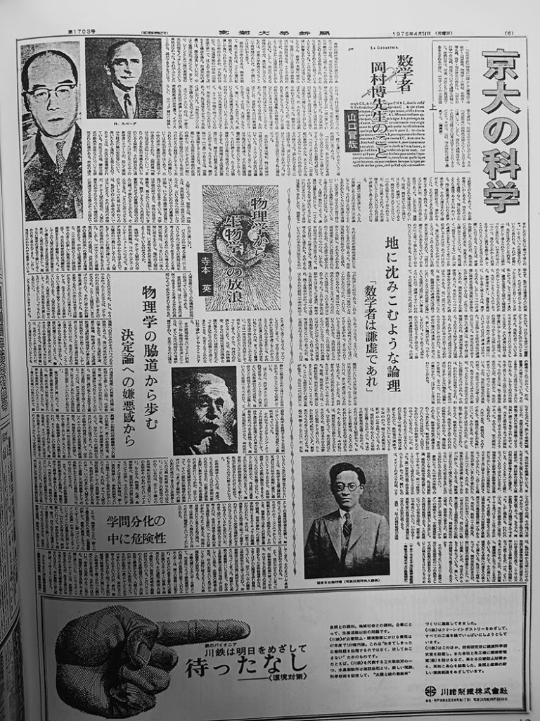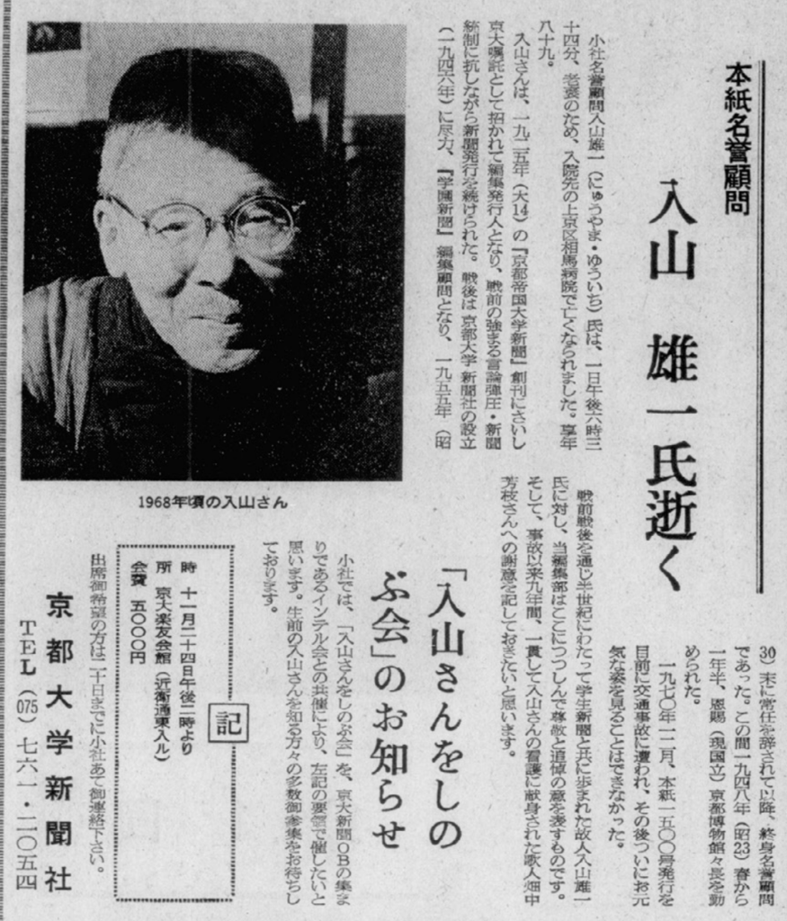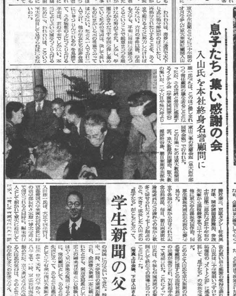 入山雄一氏は、学生の新聞づくりを見守りながら、ときにみずから原稿を執筆することもあった。数々の書評のほか、戦前や戦後すぐのころの京大や編集部の様子をつづった「京大むかしむかし」などがある。
