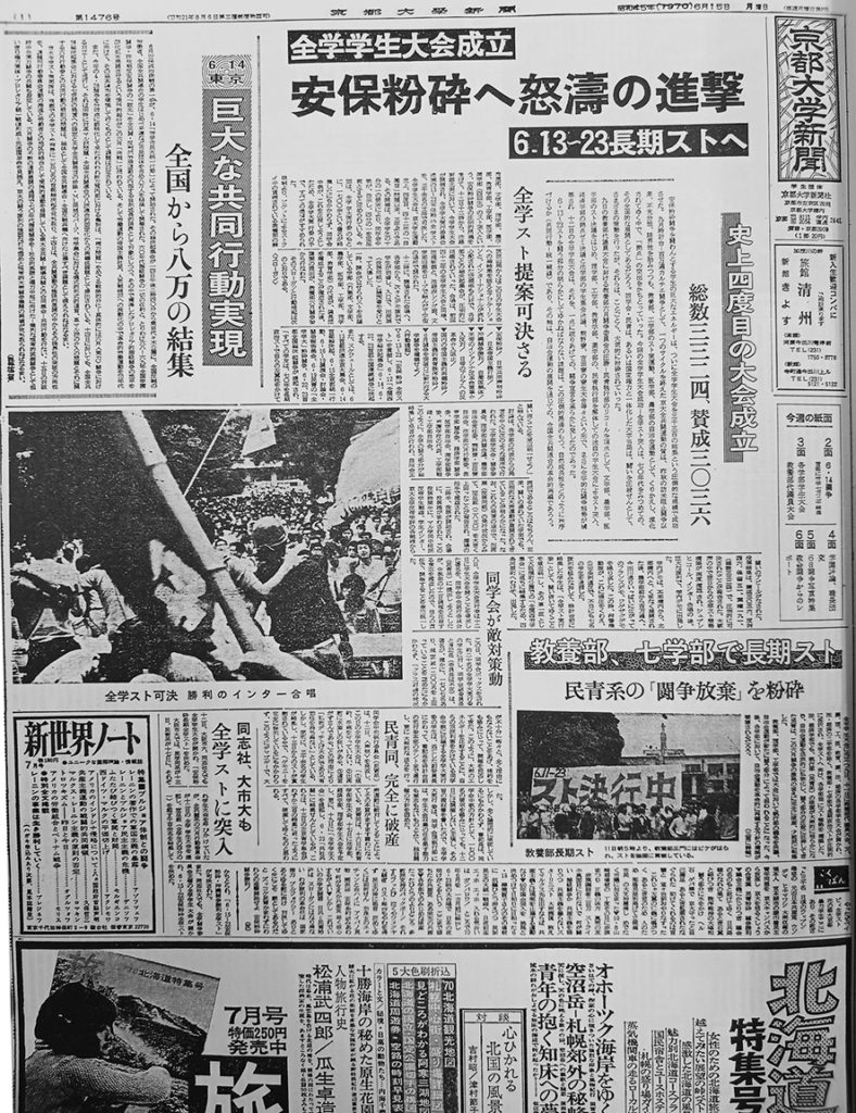 新聞社▼定期購読:年550円▼全日本学生新聞連盟(全学新)再建、第25回大会開催:75大学から参加/代表者会議には青学、阪大、大阪市立、岡山、京大、実践女、高崎経済、中央、東大駒場、一橋、法政、北海道、松山商科、横国、和光/闘争の情勢で機能停止していた▼関学新も開催:35大学/全共闘運動を総括/常任委は阪大、大阪市立、大阪工、関学、神戸商、京大、桃山、立命→弾圧の現状を確認/姫工、京工繊が加盟▼こくばん(編集員コラム):新聞研究会なるものが活動し第2新聞創刊の動きが見られるが、僕らは僕ら 時事▼任錫均の自己批判書▼ブルジョアにおもねる共産党:矢田差別事件に露呈▼三里塚で測量強行に労学2千の座り込み▼国鉄3万人削減▼春闘46万人▼万博、権力の網と華やぐ色彩▼立川基地に3千名:自衛隊解体へ▼安保自動延長に自民党「国民的合意成立」▼学園評論(社説):入管体制を粉砕せよ→徹底的にその反革命性の暴露と攻撃を/弁護士寄稿も▼労働運動関係者シンポ:大阪中電、京大病院など▼中曽根訪米:基地統廃合を促進▼新東京国際空港建設を阻止せよ▼ルポ:中国、人民の日常▼北富士闘争:農民がゲリラ戦で米軍演習を阻止▼仏ゼネストの拡大と限界:とりよせた資料の訳出▼本紙編集員、沖縄へ到着:「国政参加」選挙を焦点に→「本土への復帰」の内に階級性をはらむ/沖縄渡航のパスポート申請が却下された/本紙編集部は旅券事務所を弾劾▼こくばん:四条通り「歩行者天国」は権力の欺瞞▼元自衛隊員討論会:天皇陛下のためなら死んでもいいと思った/上官に言われれば相手が一般市民でも‥‥▼パリ通信:特派員報告/甦るレジスタンスの歴史▼裁判闘争の諸課題→拘置所にはいまだに数百名の学友 大学運営▼時計台裁判(※)に機動隊が乱入▼前田学長インタビュー:学生との討論は困難▼入試で全学ロックアウト▼東大改革準備委、大学法人化を提唱→文部省の自治介入を批判▼教官への処分攻撃すすむ:医学部で粉砕闘争へ▼農学部教官10名逮捕▼レッドパージ:教育学部→闘争に参加した学生が院入学を阻止された▼創立記念行事、昨年は闘争で中止も、今年は実施▼新病院長インタビュー:移転阻止闘争に「権力導入はあり得る」▼職員にとって京大闘争とは:編集部「京大職員共闘会議の結成は劇的であった」▼「筑波新大学」構想まとまる▼学生集会に同志社当局、機動隊導入:46名逮捕▼立命大闘争圧殺:総長が退寮命令/寮側からのアピール文掲載/立命百万遍寮破壊さる 学生▼文学部、政治ストへ:教養部も▼総長団交で活動破壊に反撃▼御堂筋に1万:全国全共闘の再編迫る▼69年京大闘争総括へ:寮闘争の全学化を追求した学生部封鎖→寮闘争委の摩滅→時計台封鎖→C争委の空洞化という痛苦の過程/我々は闘わざるをえなかった▼サークル紹介▼新入生座談会▼新病棟移転阻止に決起せよ▼親学会が解散:戦後の混乱期に学生バイト供給団体として設立/添削業務など受験事業を展開する一方、入試粉砕闘争で態度を打ち出す必要に迫られ、明確に提示できず▼全学学生大会、安保粉砕へ史上4度目の大会成立▼日大全共闘・中村君、右翼に虐殺:官憲は死因隠蔽▼寮選挙:吉田・熊野で闘う執行部 広告▼全面広告(日鐵/富士フイルム/伊藤忠/日本リクルートセンター:コンピュータ入門)