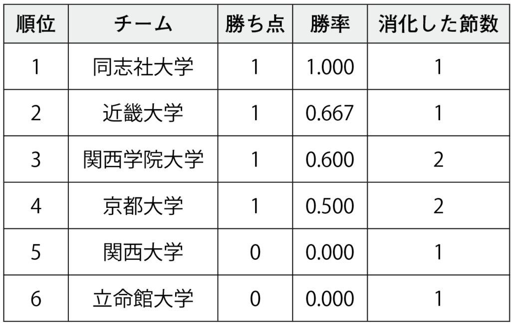 【解説】リーグ戦は5節にまたがる総当たり戦。先に2勝したチームに勝ち点1が与えられ、勝ち点の最も多いチームが優勝となる。勝ち点が並んだ場合は勝率で順位を決定する。下が4月16日時点での順位表。