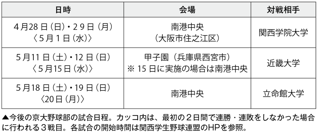 昨年までチームを引っ張った水江日々生が引退する中、チーム一丸となって勝ち点をもぎとった。2日目に先発した玉越やスタメンマスクを被った松本をはじめ、2回生も台頭した。躍進をはかる京大硬式野球部の活躍に今年も目が離せない。