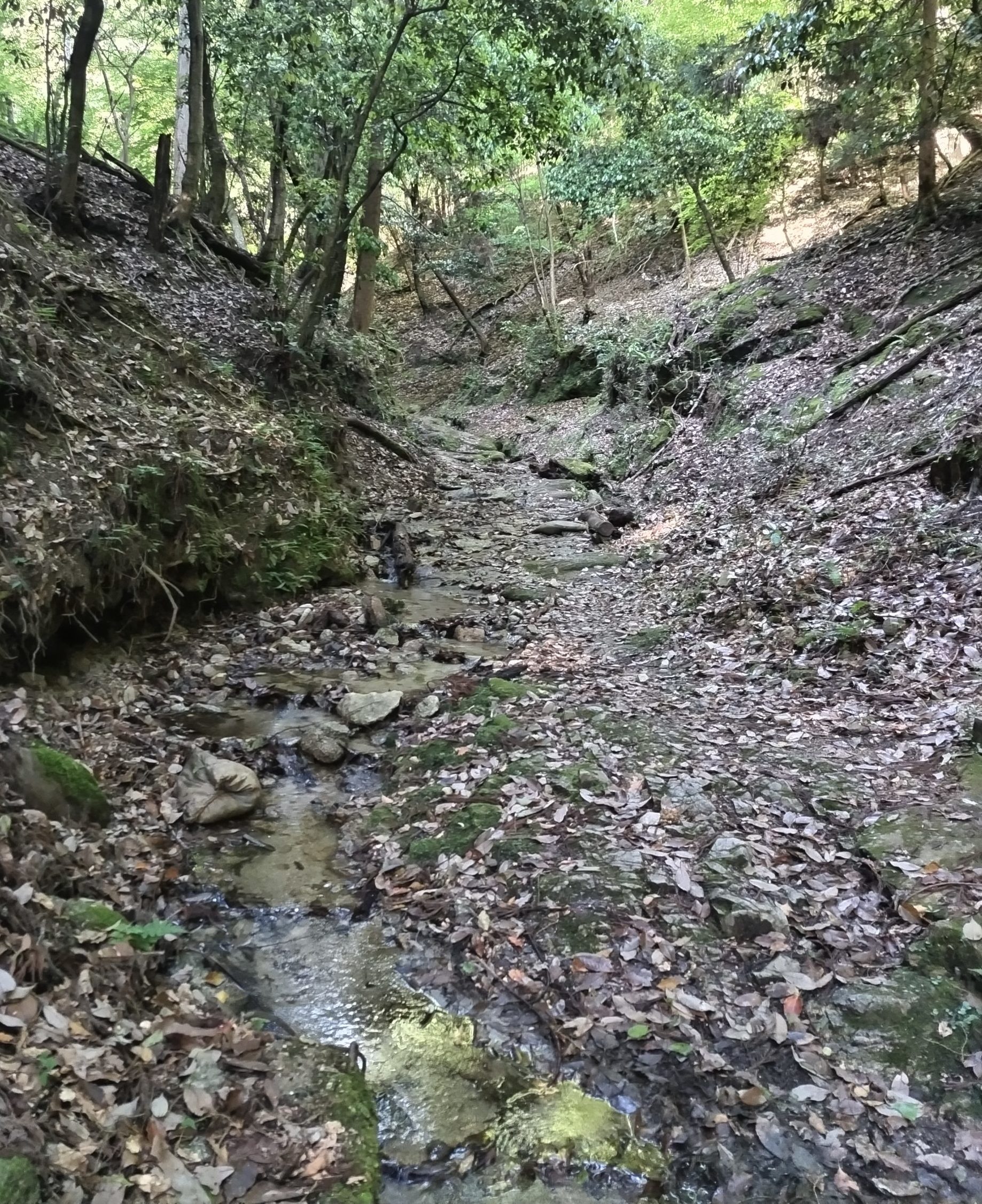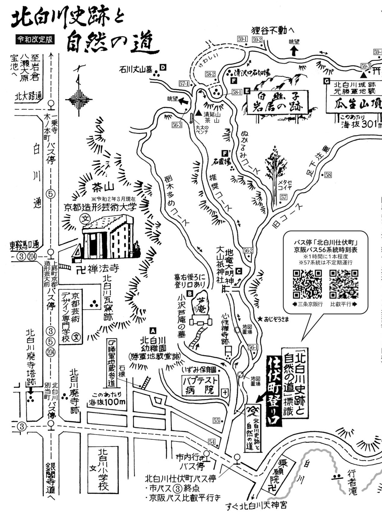 京大に通う人間なら誰もが目にしたことがあるであろう市バス3号系統の終点「北白川仕伏町(きたしらかわしぶせちょう)」。そのそばのバプテスト病院の脇に、地域の方々が整備したハイキングコース「北白川史跡と自然の道」の案内がある。石がゴロゴロと落ちている小川に沿って、というよりも小川の流路の只中を進んでいく。ものの10分足らずで、苔むした神社に着く。道が二手に分かれ、左に進むと、その先は落ち葉が敷き詰められた急斜面だ。木に結ばれた赤や黄色のテープと地図を目印に、少し不安になりながらも進むと、20分ほどで、白幽子の住んでいたとされる岩穴跡に到着する。