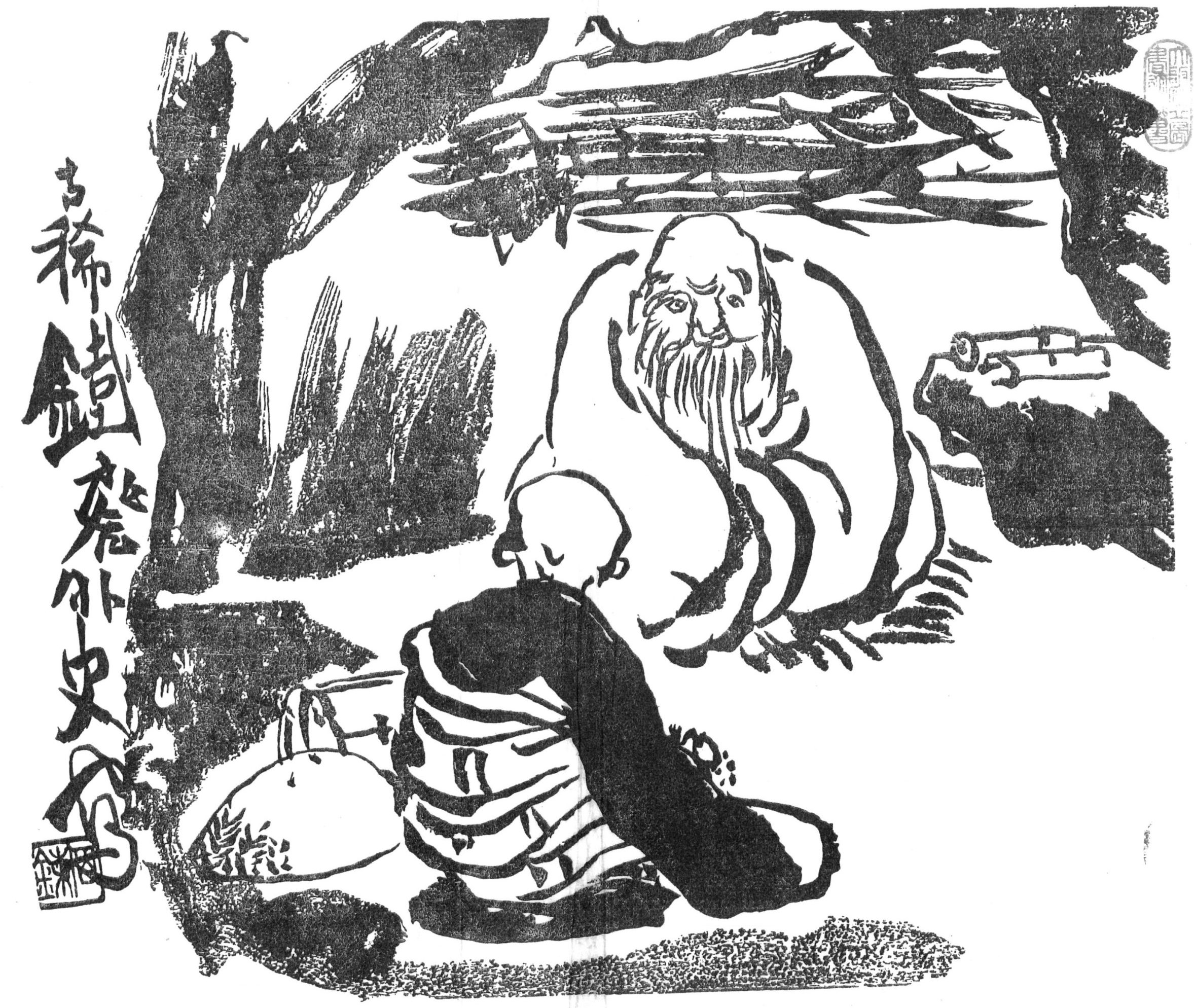 そこで、1710年の1月中旬、東美濃から京都に向かった。荷物を茶店におろし、村人に白幽子の住まいを尋ねると、遥か遠くの渓流を指さす。渓流の水の音に従って1里ほど進んだが、渓流も道もなくなった。そのとき出会った老人は、遥か遠くの雲かすみの間を指さし、道を教えてくれた。
