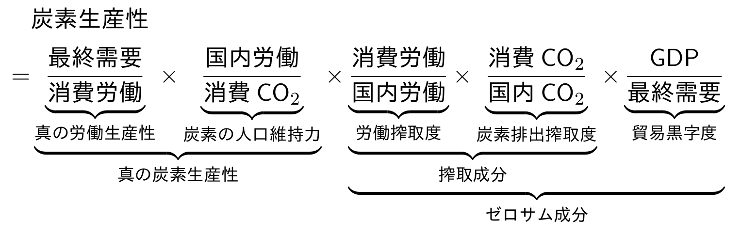 図:炭素生産性($/t)=GDP/国内CO₂の分母と分子両方に最終需要、国内労働、消費労働、消費CO₂をかけて整理したもの