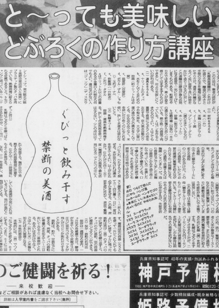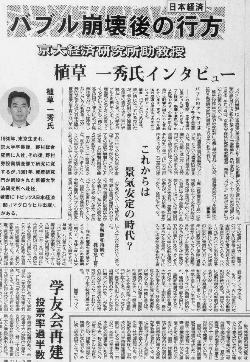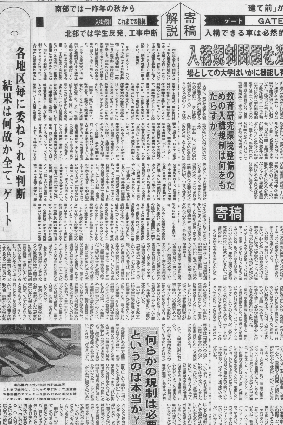 新聞社▼『V・O・K・U』→創刊2年目の総合情報誌/定期購読・年2千円 時事▼シンポ「コメ輸入自由化」開催▼かんぼじあ通信:国連ボランティアの便りを転載▼不況の波に抗する釜ヶ崎:日本最大の寄せ場▼内定取り消し企業に報告義務▼皇室報道の犯罪:共同通信記者▼意外といいかも?公務員就職:今春就職の卒業生に聞く▼NGO「就職」事情▼どうなる牛乳パック回収:大変な仕分け作業▼モザンビークPKOを考える:中部大学講師寄稿▼朝鮮学校生が署名活動:民族学校の処遇改善訴え▼フランス訪問の旅:もんじゅスタッフ寄稿▼複眼時評:国産米食ってカエルを守ろう▼アジア第三世界と連帯し、日本の侵略とたたかう国際連帯学生集会開催:同志社大でフィリピンの学生を招く 教育研究▼『人間の価値』:1918〜45年のドイツ医学展▼人文研客員教授、大麻密輸▼寄附講座とティーチング・アシスタント、評議会で規定決まる▼さよなら教養部:「紛争後」パラダイムの終焉▼10年一貫教育体制へ:医でも大学院重点化/社会人も受け入れ▼全学共通科目本格化:煩雑さに不満も▼北部構内農場で田植え:不作も研究には豊作?▼理学部建て替えと自然史博物館計画▼独立大学院構想が進行中:生命科学科など▼生態学会が要望書:芦生演習林の保全▼放送大学、京都ビデオ学習センターが京大構内に▼農・改組構想:学科を10から3に▼連載・研究室の虚実:検証・矢野問題→表出した強姦事件、全面否認で辞職▼独立大学院構想、「総合エネルギー科学研究科」:各部局の「切り売り」が焦点に▼総合人間学部、教官アンケート:担当教官の不満「一体どんな授業をすればよいのか」 大学運営▼ゲート問題本部構内説明会:学生との話し合いで紛糾→暫定措置へ▼西部裏の留学生寮建設:工繊大当局が説明会▼西部構内に車止めチェーン設置▼人間・環境学研究科、新研究棟建設へ▼北部構内の道路上に障害物設置→バイクの速度が出ないように/「学外者らしき人がシンナーを吸いながら車を運転」との苦情も▼総合人間学部で当局がビラ剥がし強行:学生が抗議▼北部構内ゲート規制実施へ▼第3キャンパス構想再浮上:候補地として関西学研都市、利害調整が焦点▼授業料、学部間格差導入か▼理・改組へ:修士8割増で学部定員を超える▼時計台前、石畳敷設工事 学生▼バイトあれこれ:プログラマー▼サークルカタログ:少林寺拳法「やらないのは不幸」▼熊野寮にガサ入れ:別件捜査の疑い▼農・自治会再建へ:常任委7年ぶり発足▼ウエイトリフティング部の選手が世界ジュニア選手権出場▼七大戦、京大優勝▼相撲部:東南ア研横にある土俵▼文・学生大会成立→学部長と団交▼日本の戦争・戦後責任の解決求める日韓学生実行委結成 文化▼猛虎全国ツアー:阪神の選手名と同じ駅名乗りつぶし▼あーす書房オープン▼パチンコ東西対決→サクセスブックで人気の2人の対決▼CD評:マルコムXスピークス→アメリカは白人以外を必要としない▼特集:週刊誌『金曜日』を考える→腐敗の補完物としてのマスコミ▼『噂の真相』編集長インタビュー▼ポルトガルと南蛮文化展▼新入生アンケート:入学理由「学風が合いそう」44%→回答数は約600件▼レズビアン&ゲイ映画祭:西部講堂▼書評:生殖医療の現在/医者の権力の実態▼『痴呆好況団体』公演中止の取材をめぐる私見:ともに意見を述べ合うことが大事▼複眼時評:巨人にキューバの選手は来るのか▼旅行特集:人気1位は応酬→HIS社員談話も 広告▼HIS▼社会保険庁▼センターリサーチ→河合塾29万人、代々木30万人、駿台27万人▼ダイキン・テクノロジー「未来に夢、走ります」▼日住サービス幹部社員候補特別採用