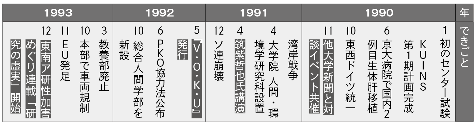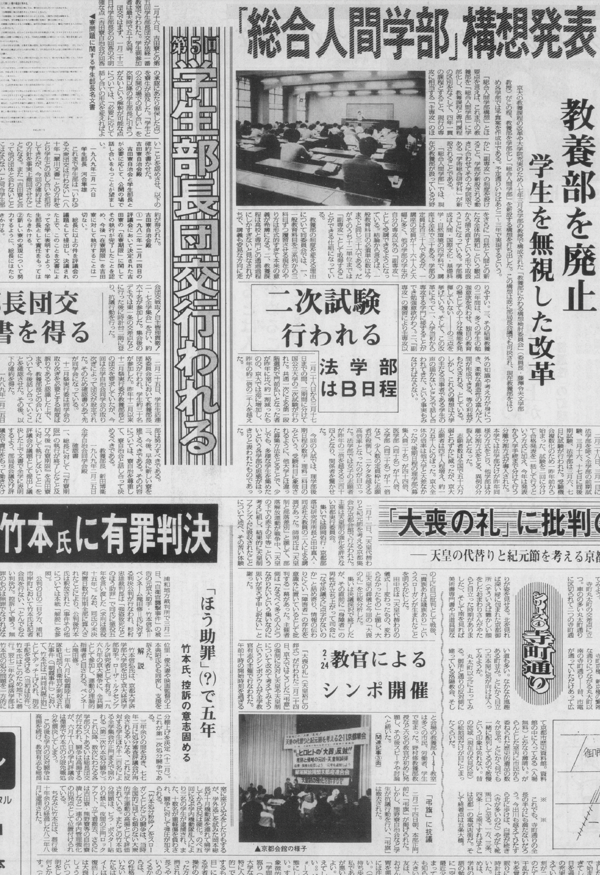 新聞社▼工繊大新聞・同志社学生新聞局と共同でイベント開催:「メディアを探るクロストーク」▼『権力にアカンベエ』1600円:京大新聞編集部が見た「昭和史」▼『就職専科』本年度も発行→「京阪神3大学の4回生にDMで届く▼編集部より:言い訳できないほど発行が遅れている/12月号より受験生特集号を先に発行した 時事▼原理研の活動と実体:40日間の合宿▼新連載:バングラデシュルポ→いつも生ゴミが放置▼終われない水俣展▼海外ミニ通信:スペイン▼寄稿:反アパルトヘイトのこれから/南ア問題研究会→編集部:マンデラ氏釈放も手放しに喜べない▼転換期における日本とアジア〈最終回〉→編集部:「国際化」の虚実をどう照らし出すか▼甲山事件差し戻し判決抗議集会▼就職戦線早や「内々定」も▼フリーターをさぐる:理由や形態は千差万別▼シンポ:天皇制→「うまくできた制度」「国民が壊さなかったから存続」▼新連載:臓器移植を問い直す→編集部:解禁してよいか吟味/滋賀医科大教授「自分のことを自分で決めない日本人」▼新連載:地下にわだかまる余熱→ルーマニア滞在記/編集部「新政権の内実を知るうえで有意義」▼原理研、ソフト路線に変化:新聞のバラマキも再開▼梅田地下街、新聞販売店撤去に惜しむ声▼京都府、鴨川ダム建設を断念▼シンポ:差別と日本社会→被差別部落と仕事▼フィリピン民主運動はいま:交流センター寄稿▼共同作業所紹介→編集部:障害を持ちながら積極的に周囲と関わり生きる人がいると聞き、うかがった▼中東派遣問題で京大職組が要望書▼ビルマ「民主化」学生の軌跡:タイ国境を訪れた京大生インタビュー▼新連載:歴史から「現在」を照射する→編集部「アジアの人々の流入が始まる時代展開をどう認識するか」▼割り箸から消費生活見直しへ:学生寄稿 教育研究▼初のセンター試験実施▼帰国子女入試を考える:通用しない偏差値の価値観▼パソコンで原発事故の被害予想:京大原子炉助手が開発▼医の倫理員会:生体肝移植を審議▼舞鶴ヘリ基地建設に反対:農・水産実験所が要望書▼教養部当局が大学改革を考えるシンポ開催▼連載・教育の不自由:ペーパーテスト入試の功罪▼数理研森教授フィールズ賞▼教養部改革始動:人間・環境学科設置へ▼複眼時評:文学と経済学の間 大学運営▼京大を建てた人々:学内建築めぐり▼大学のランク付け促進した共通一次、私大巻き込むセンター試験▼KUINS第1期計画が完成:学術情報を電話回線で処理→解説:進む情報の一元管理/文部省の政策に則る→「予算が下りそうな研究を」という傾向が強まる危険性▼TOPIC:落書きに当局が貼り紙「言いたいことがあるなら話し合いに応じる」→「ほんとか?」の落書きが加わる▼A号館夜間ロックアウト計画→学生の反対で回避▼倫理委、生体部分肝移植を承認→解説:脳死問題を避けられる利点→国内で2例目の実施▼移植の2児死亡:要求される術後管理▼薬学部、入館時に指紋識別装置使用▼連載:公園の風景・鶴見緑地公園→編集部:公園を媒介とする問題を考える▼学内に機動隊導入:総長室占拠の学生を退去させる▼教官有志、即位儀礼に合わせた日の丸掲揚に抗議▼京大学術出版会スタート 学生▼再生紙リサイクルへ:牛乳パック回収委員会寄稿▼経済自治会が団交:カリキュラム変更めぐり▼最後の杉本寮祭に京大生有志熱演▼サークルスポット:放送再開が楽しみな自由ラジオ/エスペラント語同好会→真の国際語目指す/賀茂川鳥類調査グループ▼工・新歓実講演:環境はなぜ壊さるのか▼熊野寮に警察の捜索、公務執行妨害で学生逮捕▼西部講堂前で焼跡ライブ▼熊野寮、寮食堂存続めぐり抗議 文化▼こくばん:手書きの年賀状は十人十色、最近流行るワープロはつまらない▼書評:『沈思』文化大革命の凄絶な証言/『病院で死ぬということ』医師によるガン患者の描写▼インタビュー・辻元清美さん:ピースボート主催者▼CD評:寂しいメジャーデビュー・上々颱風▼こくばん:「踊るポンポコリン」が空前の大ヒット▼教員書評特集▼女問研が抗議「差別を助長」:映画部上映会、会場変更