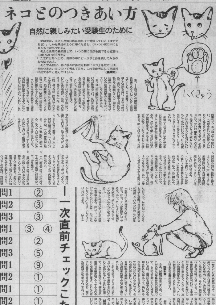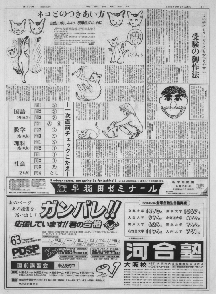 85年の受験生特集号では「阪神劇的V」なる記事を掲載。受験生諸君は目を白黒させたが、「大阪の恥」とまで罵られた阪神タイガースは現実に優勝してしまい、今では京大新聞を「予言者」として崇める動きが出てきている。京大新聞はこれを機に自らを神格化しようと企んでいるとみられるが、この件で京都テレビの取材を受けた編集員は緊張のあまり声が震えてチビったとの情報があり、「神格化」は起こり得ないと予測される。